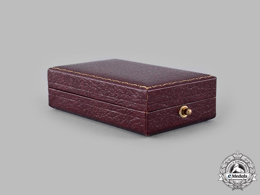 Instituted in 1888. In silver gilt with white enamels, measuring 18.5 mm (w) x 18.5 mm (h), with a push pin attachment, finely-crafted, extremely fine. In its hardshelled case of issue, simulated reddish-brown leather exterior, inside lid lined in white satin, padded and maker marked "SPINK LONDON", cherry red felt medal bed slotted to house the badge, case also extremely fine.