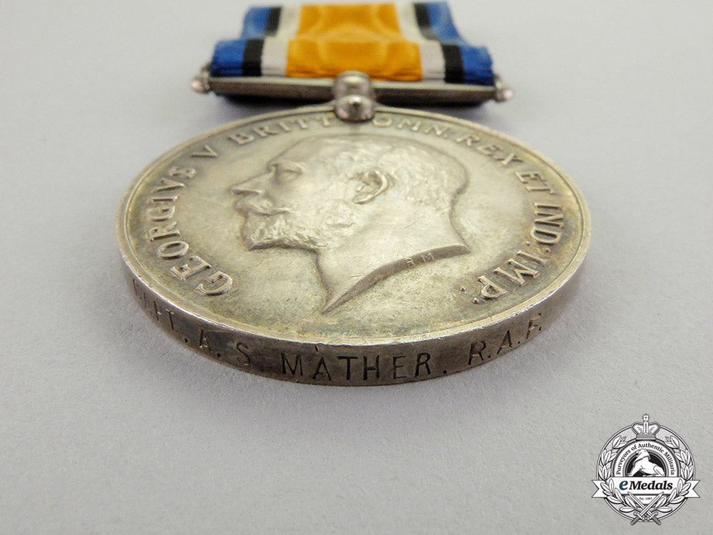 A War Medal to Captain Arthur Stuart Mather, 3 Naval Squadron, Royal Naval Air Service (later Royal Air Force), Shot Down by Pour le Mérite Recipient Oberleutnant Adolf, Ritter von Tutschek, Jasta 12; (CAPT. A.S. MATHER. R.A.F.). Naming is officially impressed. Original ribbon, edge nicks, bruised, light contact, very fine.