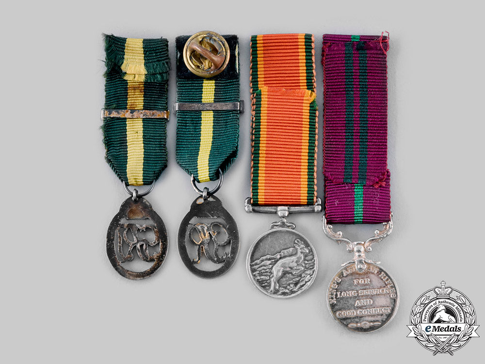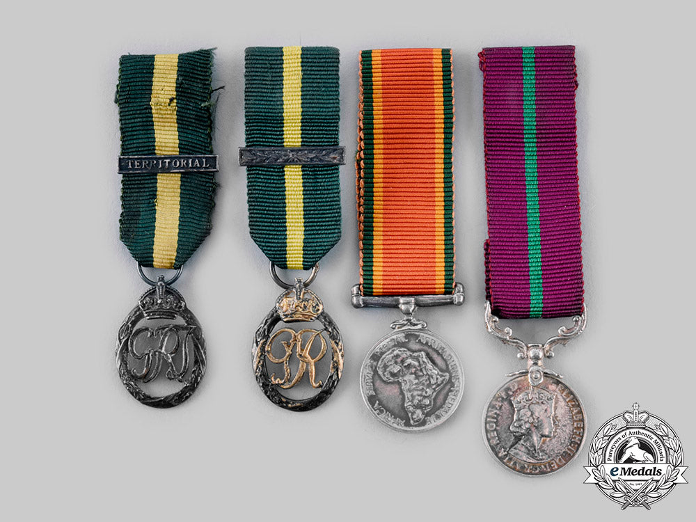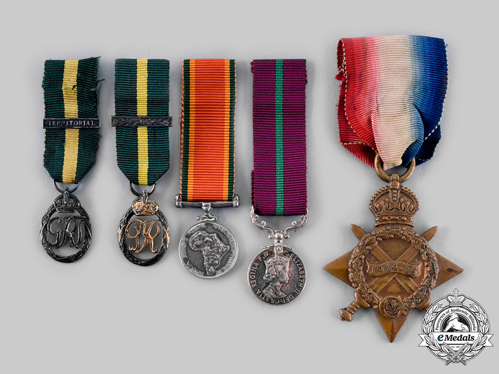 Includes: four Miniature awards: Africa Service Medal 1939-1945 (in silver, measuring 18.3 mm in diameter, original ribbon); King’s African Rifles Long Service and Good Conduct Medal, ERII (in silver, measuring 14.5 mm in diameter, original ribbon); and two Efficiency Decorations (GRI type in silver with TERRITORIAL clasp, measuring 16 mm (w) x 23.5 mm (h), original ribbon; GVIR type in silver gilt with laurel leaves clasp, measuring 16.3 mm (w) x 23.5 mm (h), original ribbon with push pin attachment); along with a Fullsize 1914-15 Star (62289 SPR: S.A. YOUNG. R.E.), the naming officially impressed, original ribbon. Ranging from fine to near extremely fine.