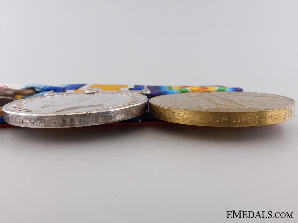 A First War British Naval Group; Sinking of SM UB-54 1918 - 1914-15 Star (GNR. J.R.E. HITON. R.N.); British War Medal (MTE. J.R.E. HITON. R.N.); and Victory Medal (MTE. J.R.E. HITON. R.N.). Naming is officially impressed. Court-mounted, light contact, extremely fine. Accompanied by a duotang folder with his military biography and five black and white ship photographs.