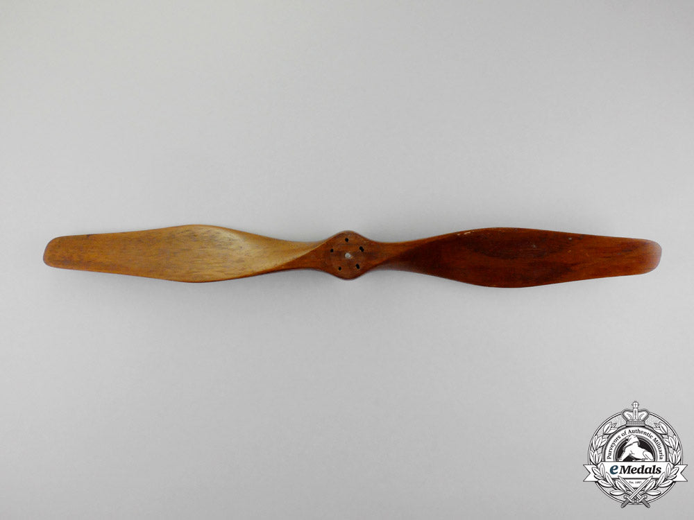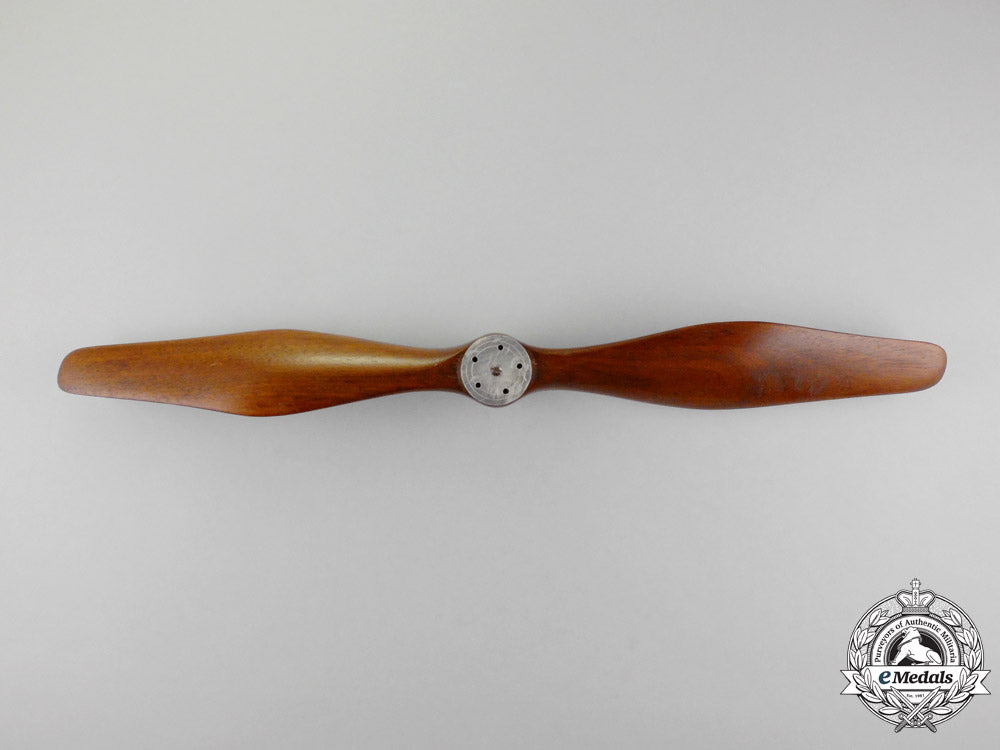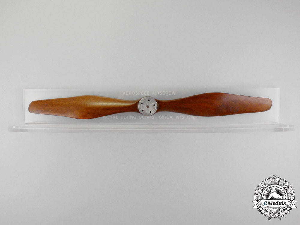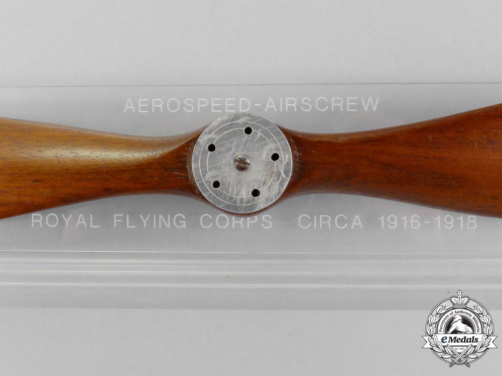 A fine first war period British Royal Flying Core Scale Airplane Propeller Desk Ornament; constructed of fine hand-sanded and stained wood, with a circular aluminum head on the obverse; the reverse with a bolt & nut assembly to allow attachment to a clear plastic desk stand, inscribed “Aerospeed Airscrew - Royal Flying Corps Circa 1916-1918”; measuring 385 mm x 40 mm; in overall extremely fine condition.