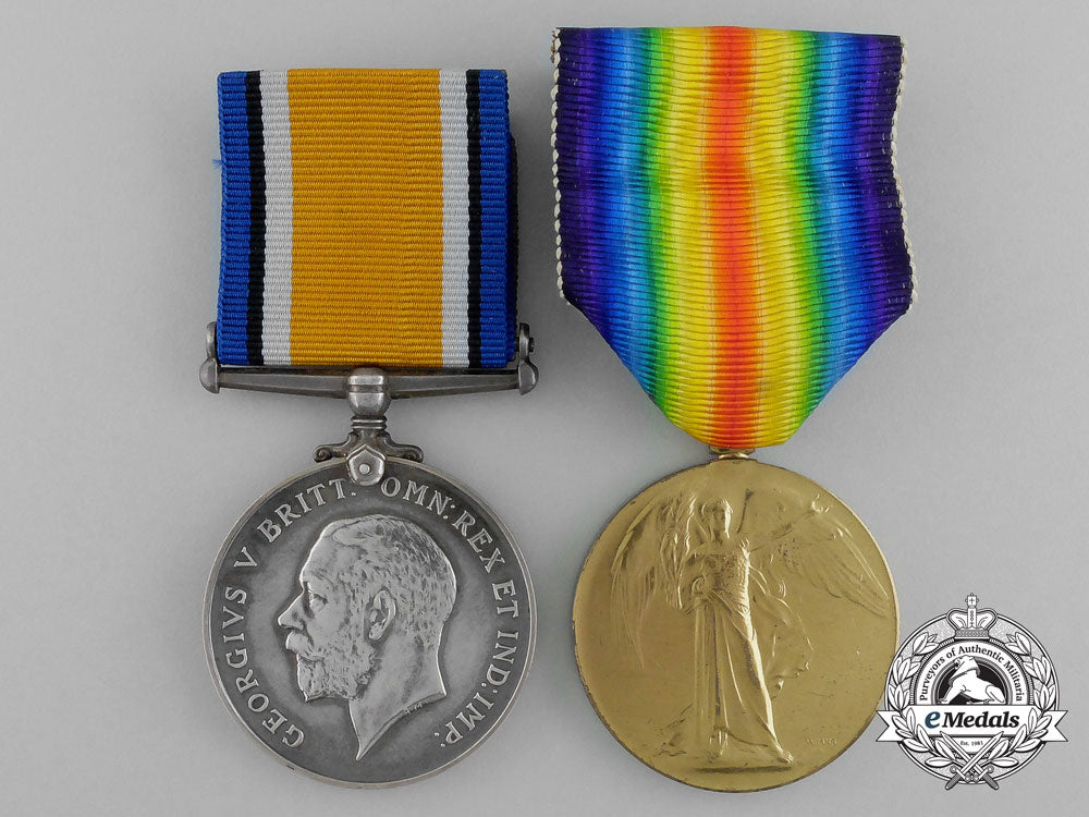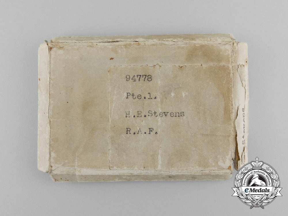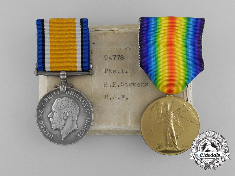 British War Medal (94778. PTE.1. H.E. STEVENS. R.A.F.); and Victory Medal (94778. PTE. 1. H.E. STEVENS. R.A.F.). Naming is officially impressed. Un-mounted, replacement ribbons, very light contact, near extremely fine. Accompanied by the two cardboard boxes of issue (each labelled "94778 / Pte.1. / H.E. Stevens / R.A.F.", with their medal envelopes inside), along with copies of two pages of his Service Records from the National Archives.