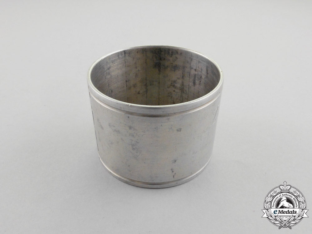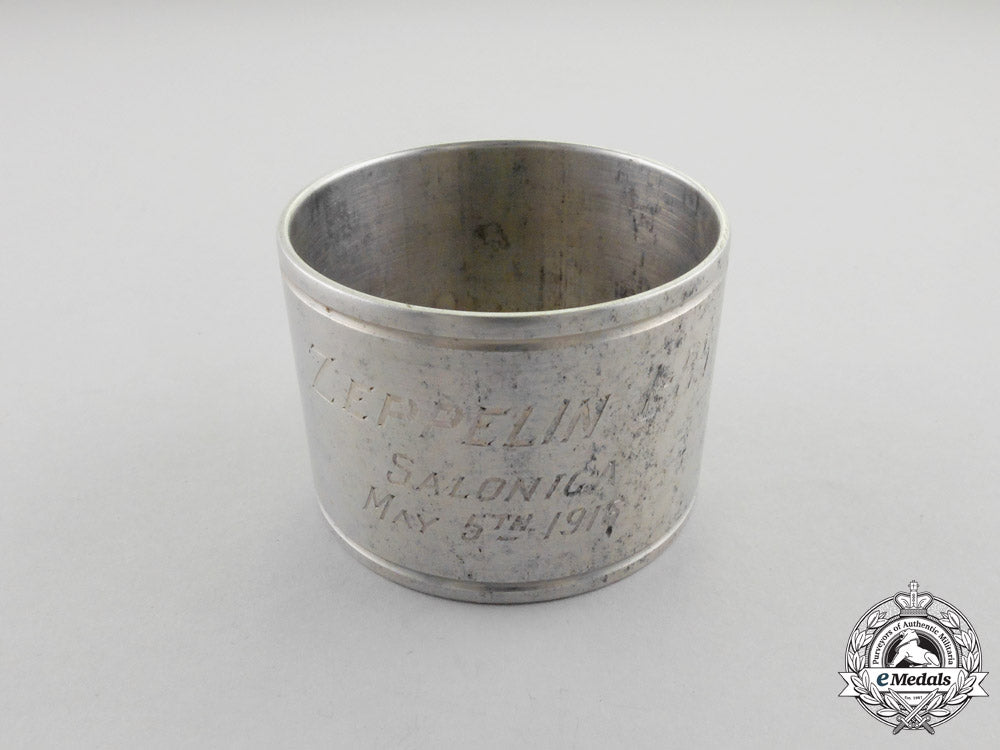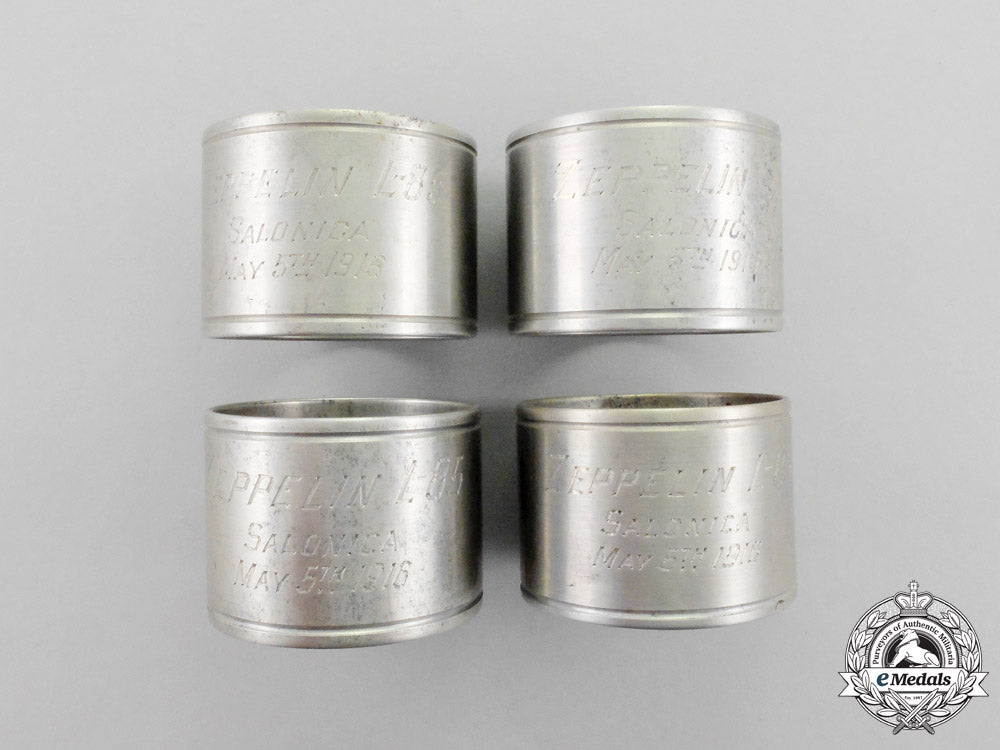 Germany (Imperial); Four serviette rings in aluminum alloy, purportedly fabricated from tubing of the downed Zeppelin LZ 85, each of the rings engraved "ZEPPELIN L-85 / SALONIKA / MAY 5th 1916", measuring approximately 50 mm (w) x 36.5 mm (h) each, very fine.