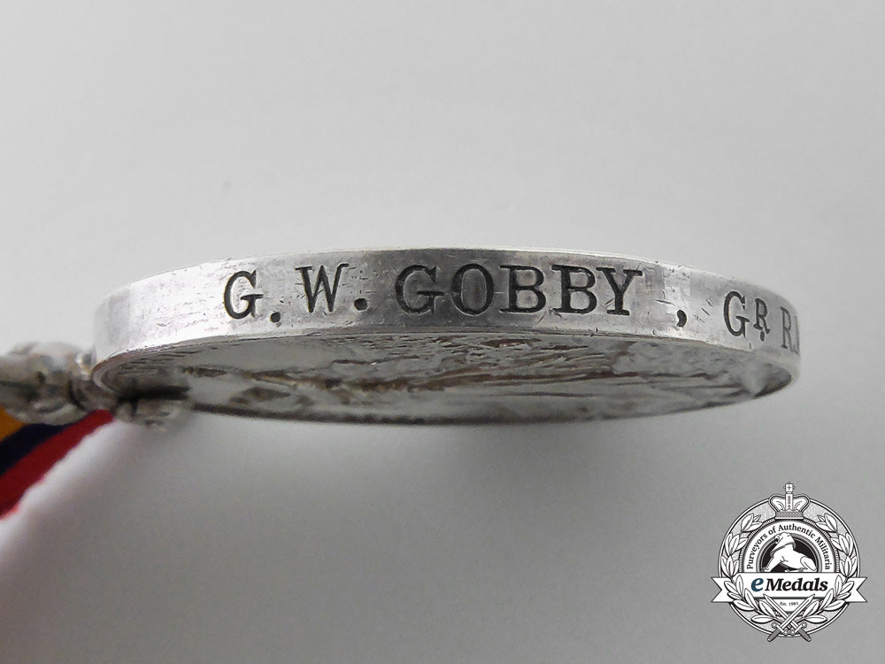 Footnote: Gunner George William Gobby, Royal Marines was born in Clerkenwell, London, England in July 1873. He enlisted for service as a Private (4522) with the Royal Marines on February 25, 1892 in London, at the age of 18, stating his religion as Church of England and his trade as that of Labourer. After training, he was designated a Gunner with the Royal Marine Artillery on November 4, 1892, continuing to serve in that roll until August 30, 1893, when he began ship service aboard H.M.S. Pembroke. Later postings would include H.M.S. Empress of India, Royal Oak, Prince George, Alexandra and Monarch. Gunner Gobby was discharged from service on February 24, 1904, at the age of 30, having completed twelve years' service. He was re-mobilized for First World War service with the Royal Marine Artillery on August 2, 1914, at the age of 41, but was declared "Medically Unfit" on November 14, 1914. He is confirmed on the Medal Roll for the Queen's South Africa Medal. He was also entitled to a 1914 Star Trio and the Silver War Badge, the Roll indicating the 1914 Star was returned to the mint.