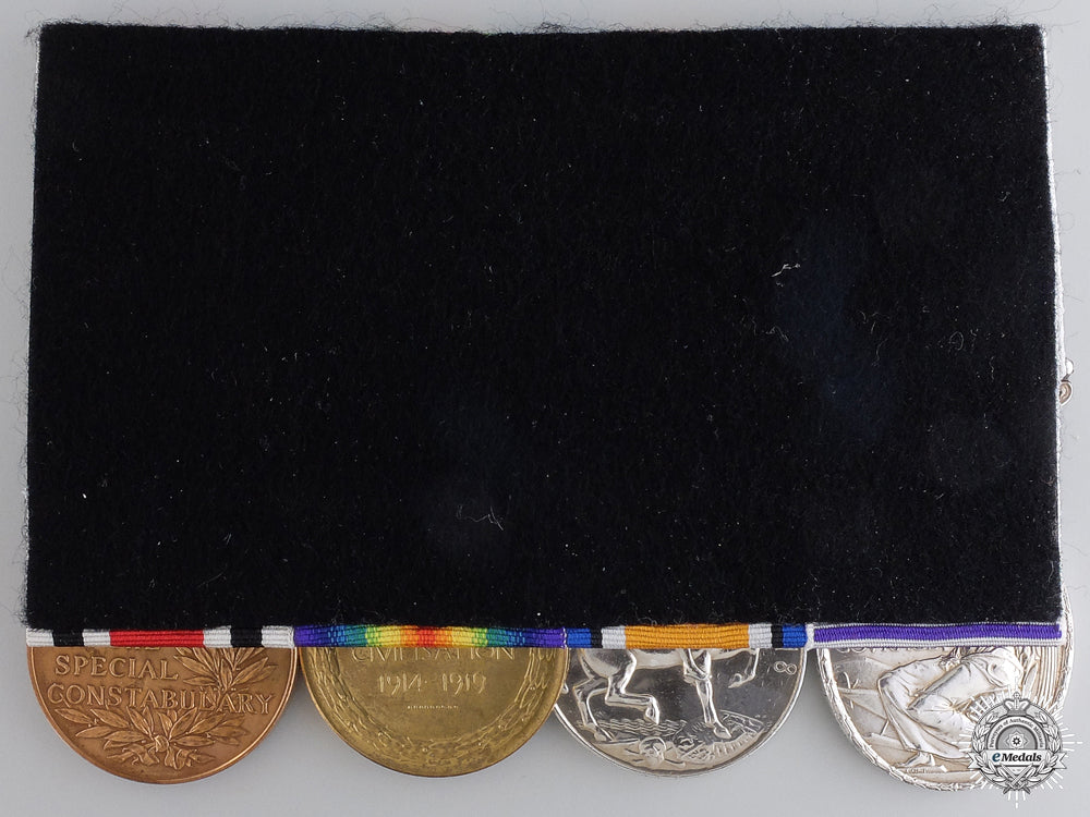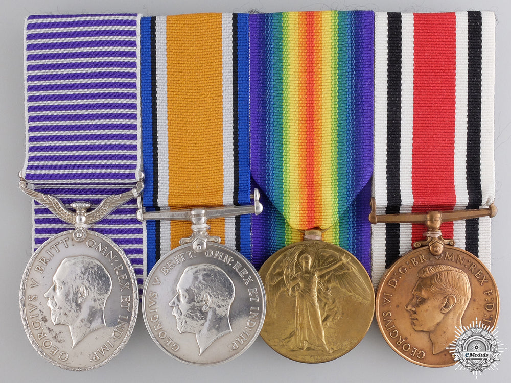 A Rare Great War DFM Balloonatics Group to Percival G. Phillips - Distinguished Flying Medal, George V, un-crowned head (33443 SERGt MECH. PHILLIPS, P.G., R.A.F.); British War Medal (33443. SGT. P.G. PHILLIPS. R.A.F.); Victory Medal (33443. SGT. P.G. PHILLIPS. R.A.F.); and Special Constabulary Long Service Medal, George VI, 1st Issue (PERCY PHILLIPS.). Naming is officially impressed. Court-mounted, slack suspension on the DFM, cleaned, light contact, very fine. Accompanied by his Pocket Barometer/Altimeter (blackened copper casing, marked "Surveying Aneroid Compensated PAT. No 23485" and maker marked "ROSS LONDON", flat glass cover, blue needle, various gradations, copper stem, 50.2 mm in diameter x 18.2 mm in depth), six Photographs from the Imperial War Museum in London (black and white, gloss finish, 206 mm x 253 mm each), copies of his Recommendation for the DFM and RAF Roll, along with a copy of the London Gazette 31098 (mentioning Phillips as a recipient of the DFM). Footnote: Percival George Phillips, a native of East Ham, enlisted in the Royal Flying Corps on June 17, 1916, for the Duration of the War. He was trained as a Telephone Operator in the field, prior to joining No. 47 Balloon Section, a component of the 2nd Balloon Wing on the Western Front. He was promoted to Sergeant-Mechanic (Air Mechanic 1st Class) on October 1, 1917, six months prior to the Royal Flying Corps and the Royal Naval Air Service merging to form the Royal Air Force on April 1, 1918. Upon his joining the newly formed RAF, he was re-mustered as a Private 1st Class. Those in balloons were nicknamed "Balloonatics", an assignment which was one of true skill, daring and nerve, and definitely far from being an easy one. A brief but illuminating summary of the trials and tribulations of the Balloonatics is to be found in the introduction to Alan Morris’ definitive history of the same title: "Perceiving their elongated brownish-grey skins the Allies eschewed the technical description of "gasbag, stabilised, captive". To them kite-balloons were "sausages", although, as the comically somnolent appearance belied their true nature, the Germans’ drachen (dragon) was more apt. Generals knew them as observation-balloons, and the Teddy Bears ensconsed in wicker cages beneath the bellies were agents of the Great War’s most devastating weapon - heavy artillery. Throughout the obscene struggle these observers were to be the only men who could speak from the air, the only ones who might disregard - in any military sense - the seasons, the elements, and even time itself. At any given moment during the final phase 300 of them would be signposting the newcomer’s path to hell. Nevertheless, to accomplish these feats they were placed in the position of goats staked out as tiger-bait, and when the luck ran out - as in 1918 it often did after half a day’s work - their end could be even more gruesome. Nor did success necessarily win plaundits. Too frequently their efforts were discounted, even derided, by comrades. Hybrids, neither aviators nor artillerymen, they endured the demands and discomforts of both occupations yet remained isolated from such benefits as might accrue from belonging to the "established" body of either Service. Consequently they came of a rare and peculiar breed, sustained by their belief that, through proxy, their deadliness equalled that of any aeroplane or submarine; and by the highest form of individual courage. Oddities in the first conflict of Mechanical Man, kite-balloon observers earned, but could never hope to receive, a completely dignified salute. When at last a tribute was paid it was a compound of amusement, rough reflection, and incredulous admiration." Sergeant-Mechanic Percival George Phillips (East Ham) was recommended by the Brigadier-General (later Air Chief Marshal) Edgar Rainey Ludlow-Hewitt GCB, GBE, CMG, DSO, MC, DL, Commanding the 10th Brigade, Royal Air Force for a Distinguished Flying Medal: "This N.C.O. is a first rate Observer who had done exceptionally good work in the air this summer. He has frequently been shelled in the air, and has helped to locate and neutralise the gun wherever possible. He has shown the utmost devotion to duty, and has been of the greatest value to his Section in every way. He has done over 150 hours in the air, and made two parachute descents." He was awarded the DFM, as mentioned in the Seventh Supplement to the London Gazette 31098 of Tuesday, December 31, 1918, on Wednesday, January 1, 1919, page 98. Approximately 105 George V, un-crowned head Distinguished Flying Medals were issued between 1918 and 1930. He was also entitled to wear the Observers Half-Wing Brevet. For his First World War service, he was awarded the British War Medal and the Victory Medal. After the war, Phillips was associated with the Cornwall Aviation Company, which carried civilians, often on their first flights, in an age when flight had been experienced by very few and was still being heavily scrutinized. It is reported that he flew 91,000 passengers, the majority of them in an Avro 504K, over a period of fifteen years. In addition, Phillips won the Devon Air Race in 1937 before a crowd of over 35,000, with his wife as his co-pilot. He flew the race in his banner-towing Avro 504NS, owned by Air Publicity Limited, but without the banners, over a triangular seventy-seven mile course. A skilled pilot with a terrific machine, he made others take notice. Other owners admitted that they couldn't remember encountering a 504 in a race since 1927. Phillips was later awarded the Special Constabulary Long Service Medal.
