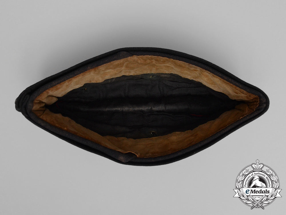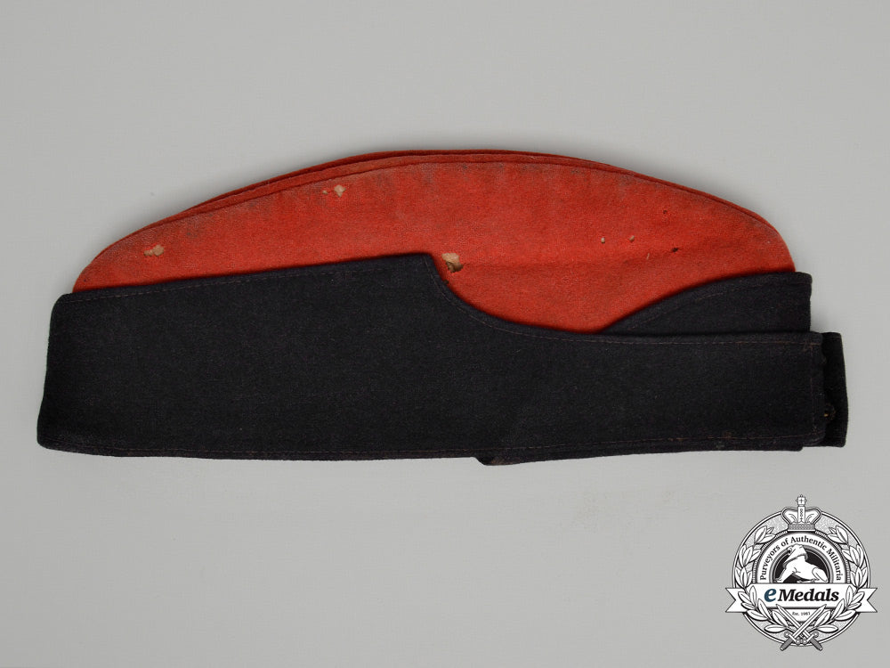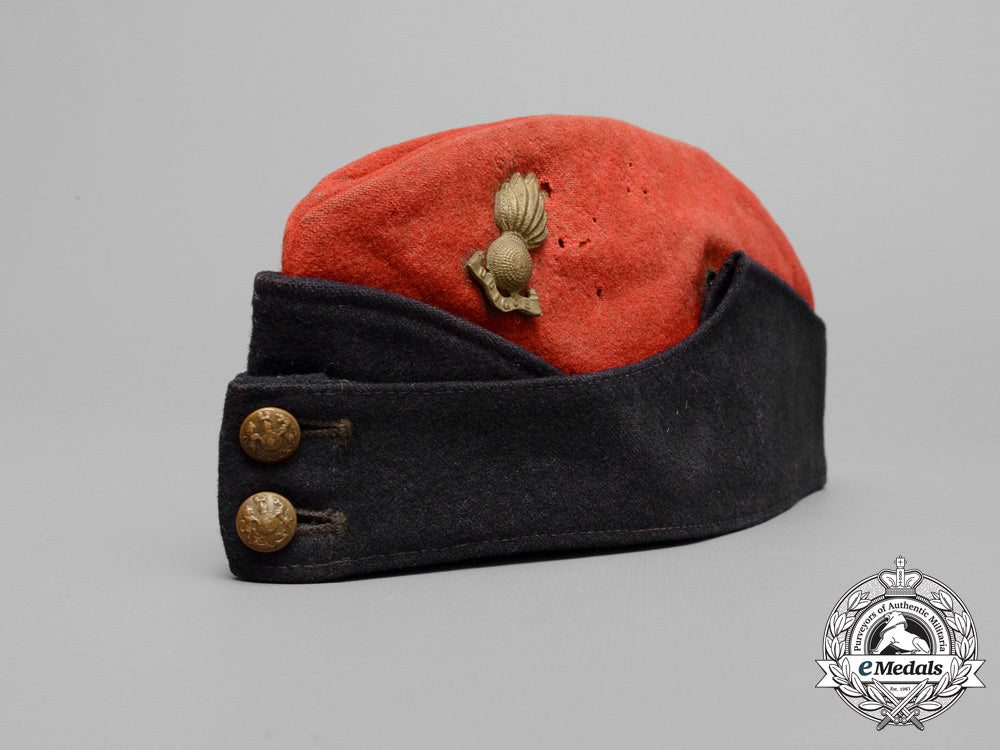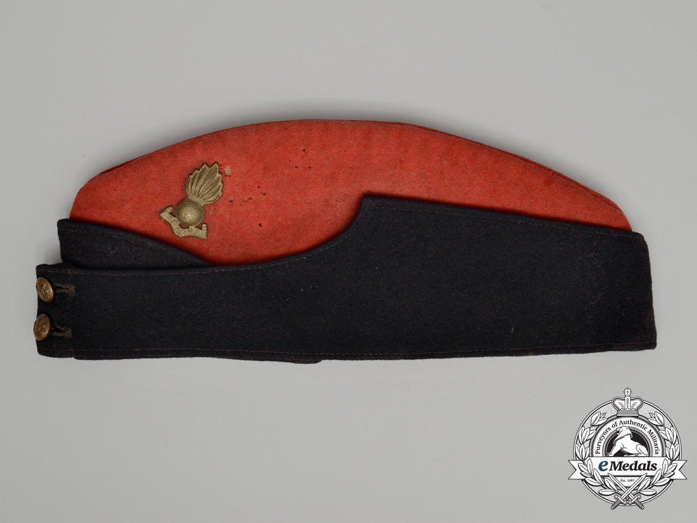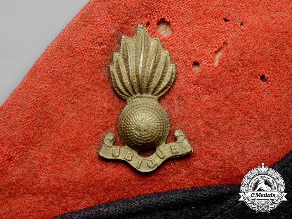 Fabricated from a red wool with fold down flaps in black wool on either side, the flaps held up with black metal hooks fed through black finished eyelets, with two rising peaks forming a valley between the two panels, the panels stitched together via two strands of light brown string, the front with two 12 mm wide buttons, the uppers of which are in bronze, the brass cores maker marked "BUTTONS Ltd B'HAM" on the reverse, each of the buttons illustrating the Royal coat-of-arms and holding the two ends of the flaps together, a 23.7 mm x 37.3 mm bronze Royal Artillery cap badge on the left side, held in place via intact prongs and pin on the inside of the cap. The inside is lined in a black cotton-rayon blend, with an 45 mm wide soft brown sweatband, measuring 102 mm x 270 mm, exhibiting scattered mothing on the exterior, soiling present on both the interior and exterior from active use. As worn.