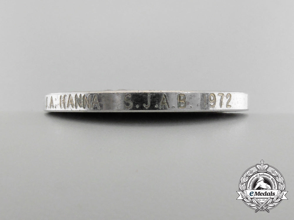 OStJ, St. John Ambulance Brigade, Toronto, Ontario 1972: (C2649 J.A. HANNA S.J.A.B. 1972). Rhodium-plated cupro-nickel, 38.3 mm, soiled original ribbon, light contact, near extremely fine.