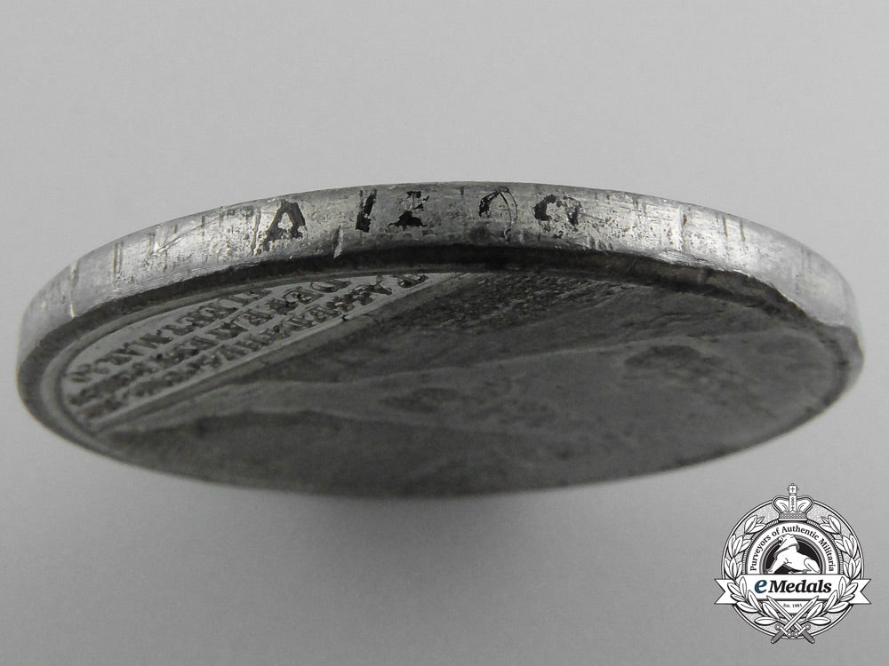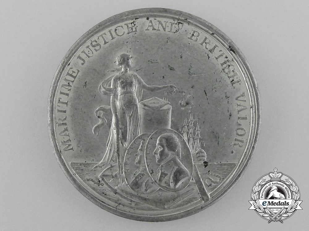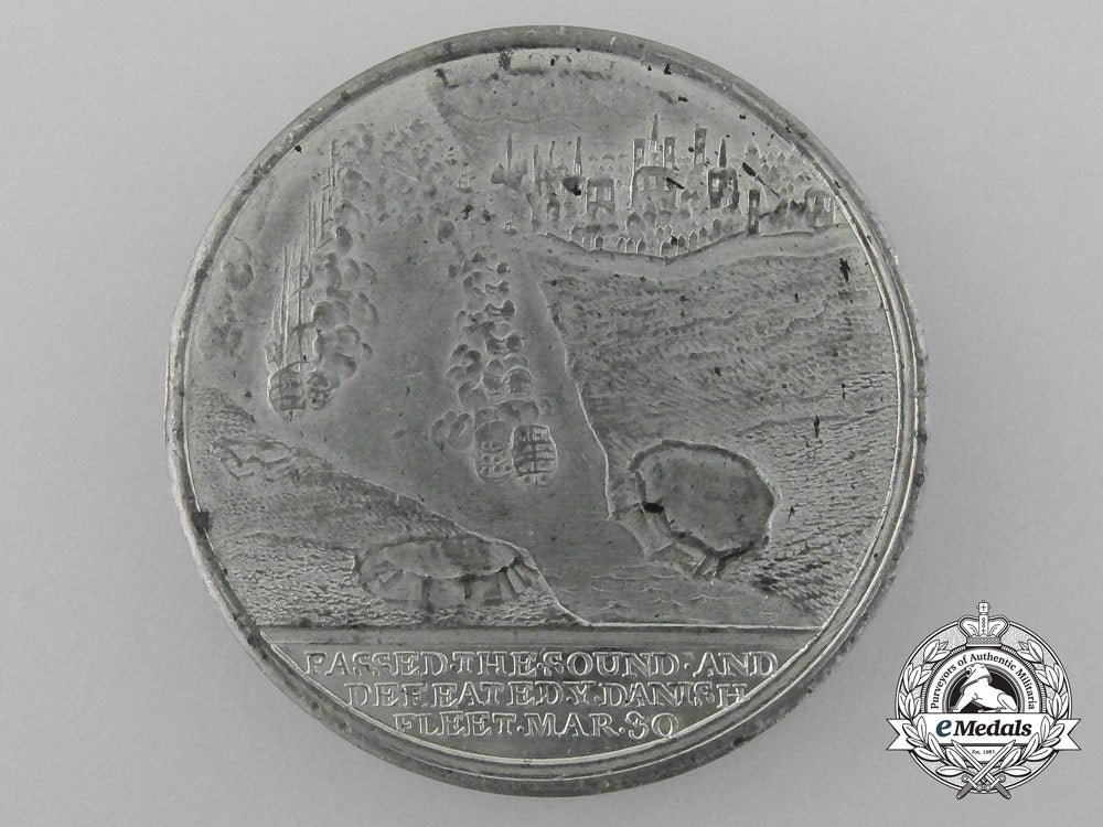 White metal, obverse illustrating Justice, a downward-pointing sword in her right hand, holding the scales of justice in her left hand, a compass on a stand beside her, the portraits of "H. PARKER" (Hyde Parker) and "H. NELSON" (Horatio Nelson) leaning against the foot of the stand, an anchor and book in the foreground, with a ship on the horizon, surrounded by the inscription "MARITIME JUSTICE AND BRITISH VALOR.", reverse illustrating the Battle of Copenhagen with ships on the sound, the city and its forts, inscribed "PASSED.THE.SOUND.AND.DEFEATED.Y.DANISH.FLEET.MAR. 30" below, 38.8 mm, faded museum mark in black ink on the edge, bruised, light contact, better than very fine.