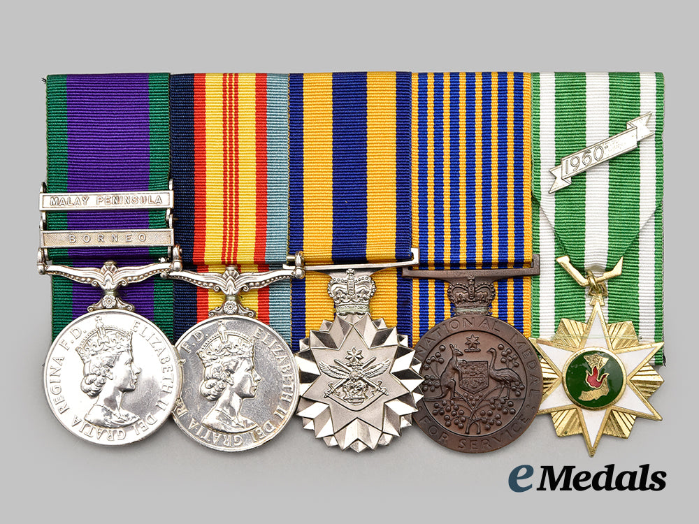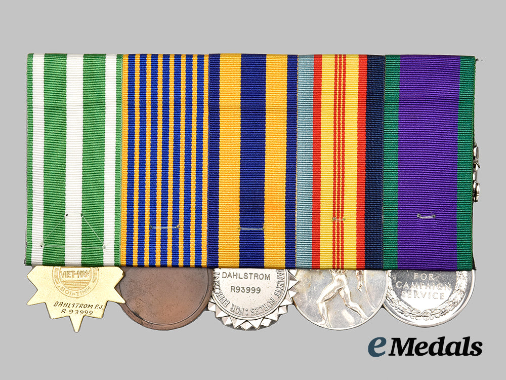 United Kingdom: General Service Medal 1962-2007, 2 Clasps - BORNEO, MALAY PENINSULA (P J DAHLSTROM R93999); Vietnam Medal (P.J. DAHLSTROM R93999); Defence Force Service Medal (P.J. DAHLSTROM R93999); National Medal (un-named); and Vietnam, Republic (South Vietnam): South Vietnam Campaign Medal, 1 Clasp - 1960- (DAHLSTROM P.J. / R93999). Naming is officially engraved on the General Service Medal 1962-2007, impressed on the Vietnam Medal, engraved on the reverse of the Defence Force Service Medal and the South Vietnam Campaign Medal. Court-mounted, very light contact, original ribbons, near extremely fine.