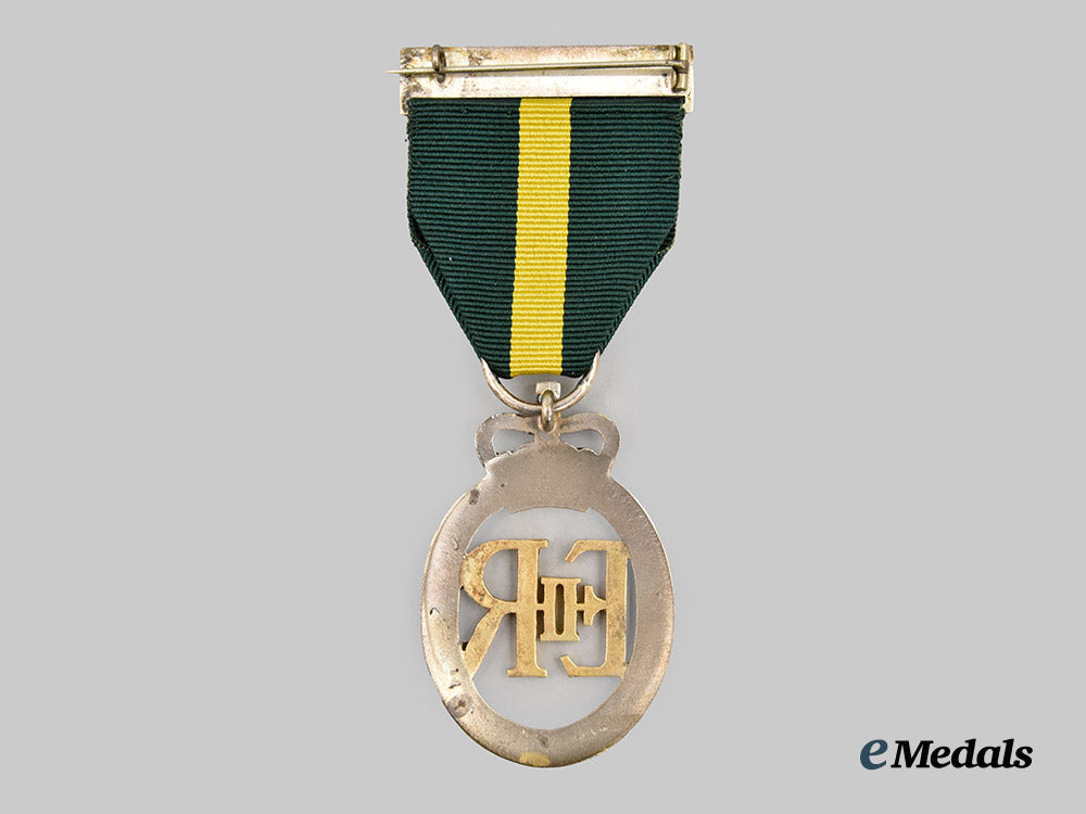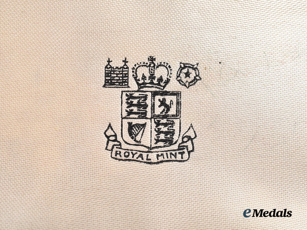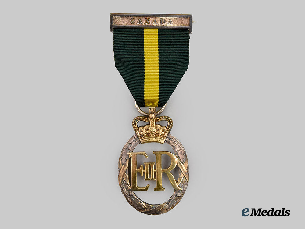 Instituted in 1930. In silver and silver gilt, an oval wreath of oak leaves, the obverse bearing Queen Elizabeth’s Royal cypher, 53.6 mm (h) x 35.5 mm (w), original ribbon, topped with a brooch bar inscribed CANADA, in extremely fine condition. In a hard-shelled case, white satin lined on the inside lid, red velvet medal bed, marked Royal Mint, extremely fine condition.