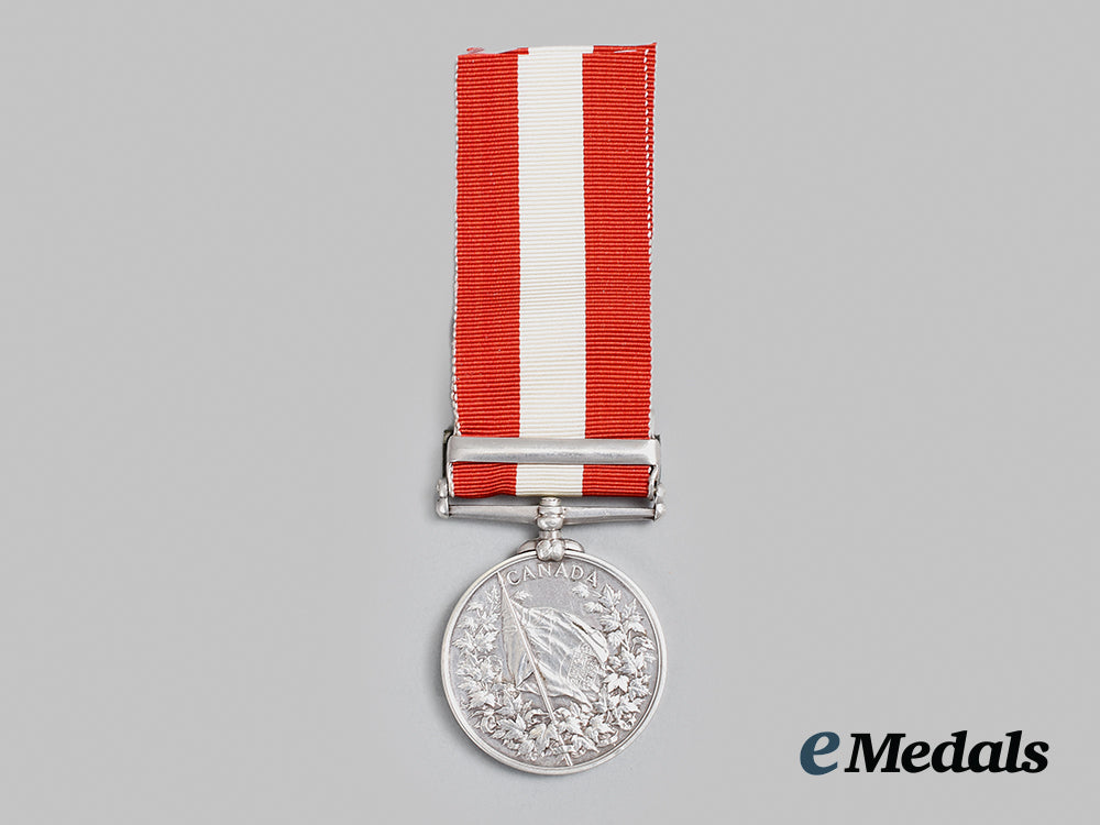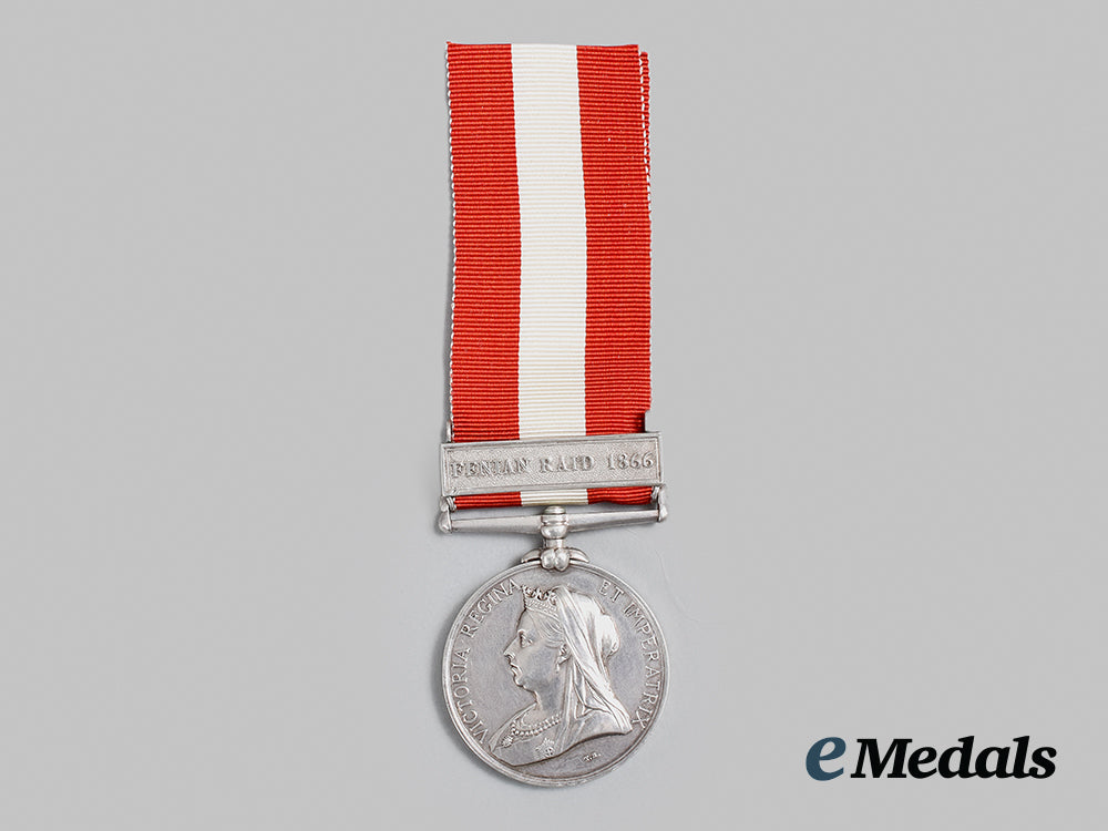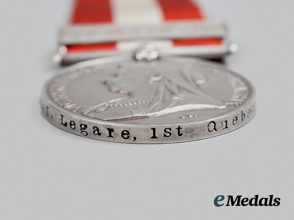 Instituted 1899. In silver, full size, officially impressed “Tr. I. Legare, 1st, Quebec. Cav.”, worn on replacement ribbon with FENIAN RAID 1866 clasp, very minor wear, bright, in extremely fine condition.
