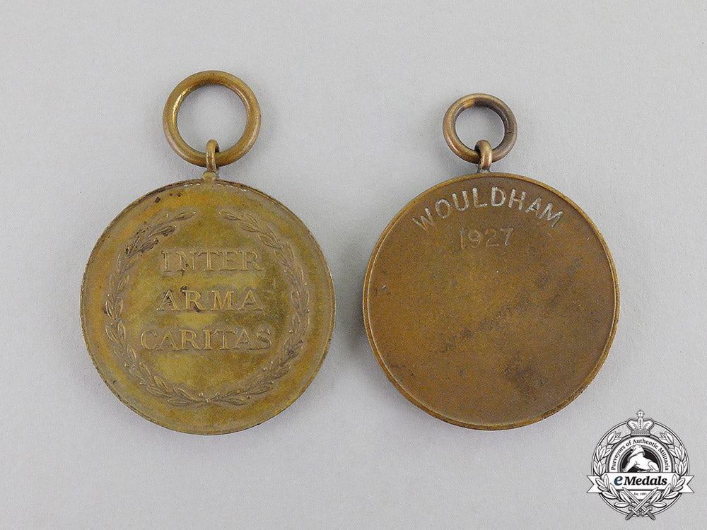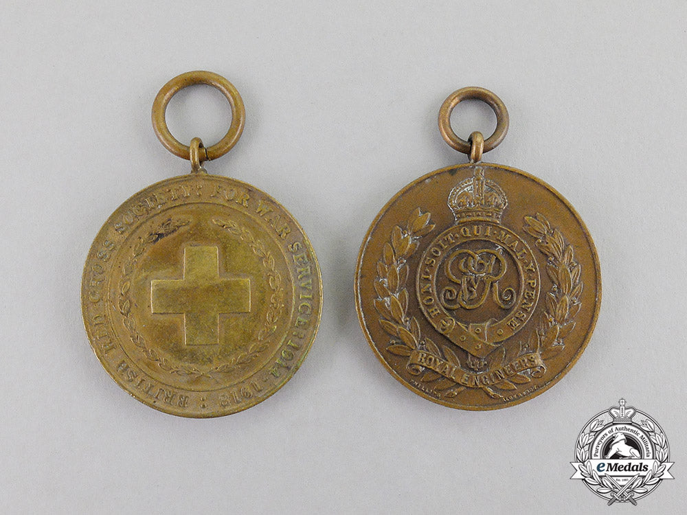 Great Britain; British Red Cross Society Medal for War Service (bronze gilt, 31.7 mm); and Royal Engineers "Wouldham" Competition Award Medal 1927 (bronze, engraver marked "PHILLIPS ALDERSHOT" on the obverse, engraved "1927" on the reverse, un-named, 32.3 mm). Very fine.