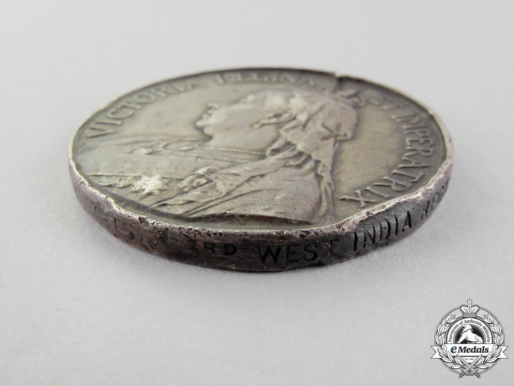 (--9 Pte ------TS 3rd WEST INDIA REGt). Naming is officially impressed, with the Private's service number and name obscured, but the rank and regimental designation clear. Silver, 36.3 mm, without its suspension, bruised, edge nicks, contact marks, fair.