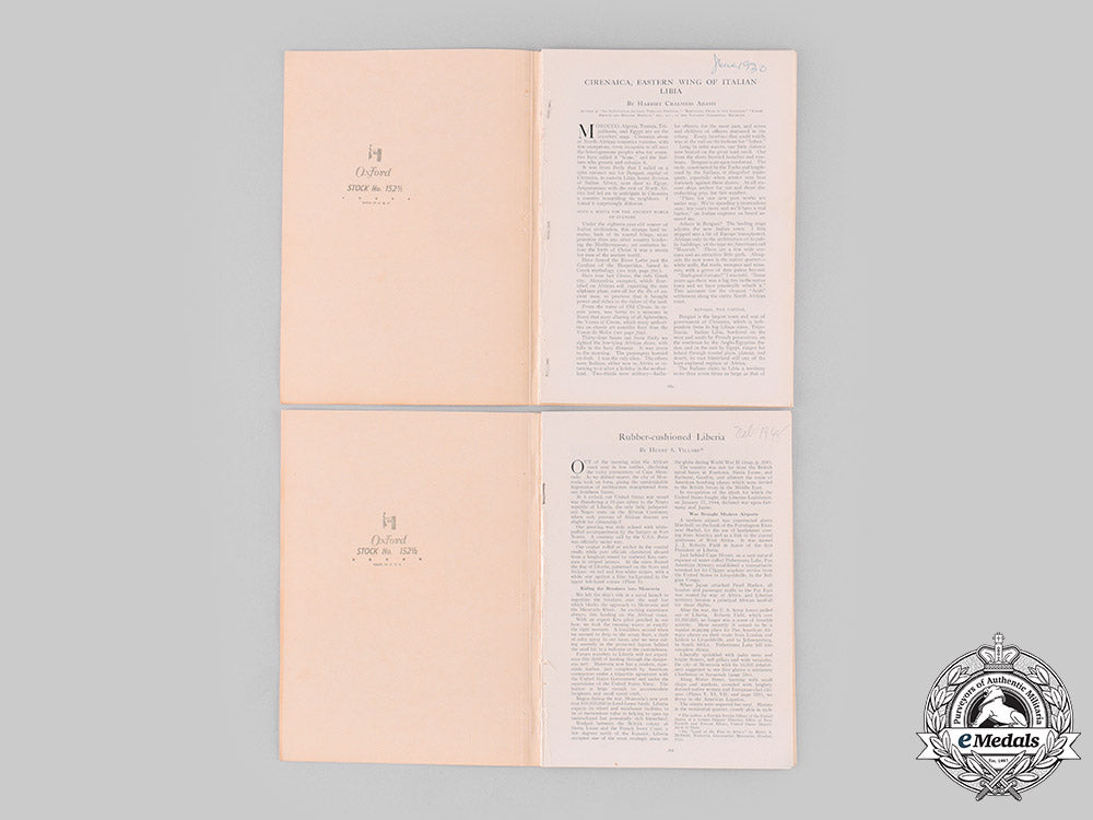 Germany, Federal Republic: Orden und auszeichnungen (Orders and Decorations), hardcover with dust jacket, distributed by Keysersche of Heidelberg and Munich, dated 1958, containing 190 pages, printed in black ink on a white paper stock, with black and white and colour plates on a coated paper stock interspersed throughout, perfect bound, measuring 110 mm (w) x 185 mm (h) x 20 mm (d); and United States: two Partial Issues of National Geographic (one dated June 1930, containing 38 pages; the other one about Liberia, dated February 1948; containing 28 pages, printed in black ink, the latter one with a few colour plates, both housed in their individual Oxford file folders).