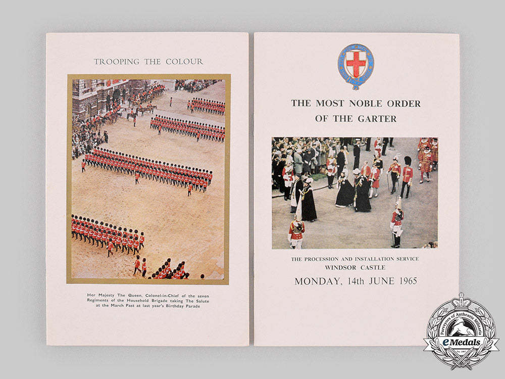 United Kingdom: The Most Noble Order of the Garter, The Procession and Installation Service, Windsor Castle Programme (dated Monday, June 14, 1965, published by Gale & Polden Limited, Wellington Press, Aldershot, containing 16 pages, with text in black ink, photos in black and white, along with a portrait of Queen Elizabeth II in colour, on a white coated paper stock, plus cover in colour, dual-staple bound, measuring 141 mm (w) x 216 mm (h); and Trooping the Colour in Celebration of the Birthday of Her Majesty the Queen Programme (dated Saturday, June 12, 1965, published by Gale & Polden Limited, Wellington Press, Aldershot, containing 16 pages, with text in black ink, photos in black and white, on a white coated paper stock, plus cover in colour, dual-staple bound, measuring 139 mm (w) x 216 mm (h);