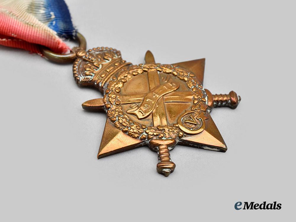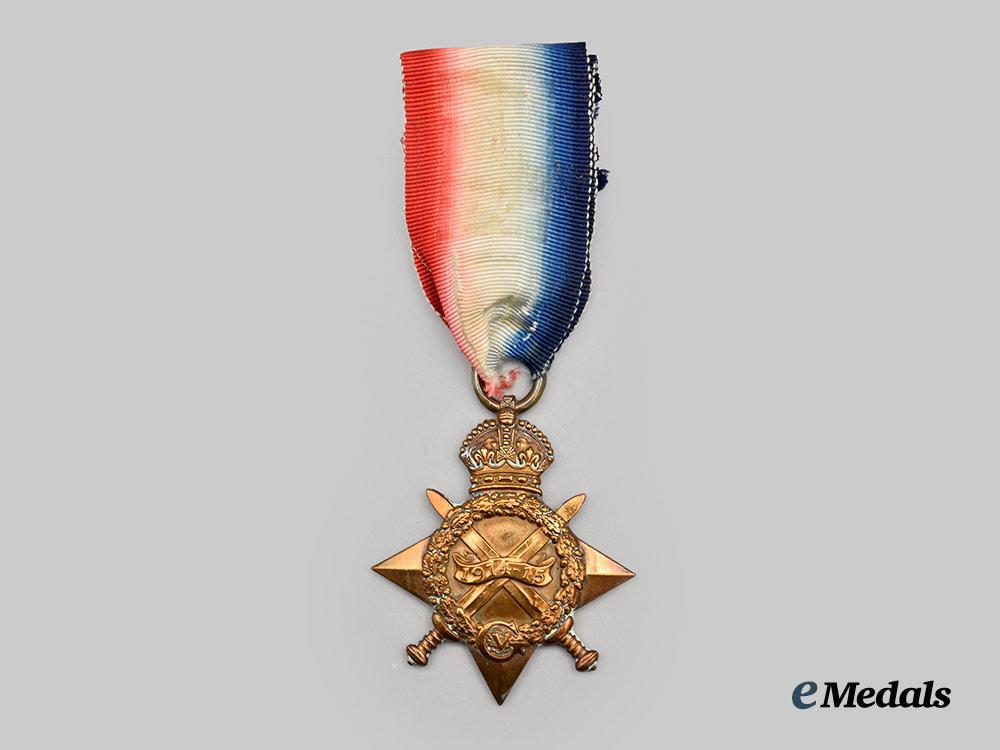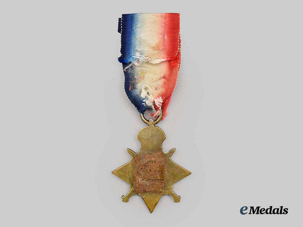 A 1914/15 Star. Instituted in December 1918. Constructed of bronze, consisting of a four-pointed star, the obverse with two crossed swords with their blades upwards, overlaid by a wreath of oak leaves, with the Royal Cypher of King George V at the base of the wreath and an overlaying central scroll inscribed “1914-15”, the reverse is plain, impressed with “21990 PTE. R.C. Dow CAN. INF.”, on a fixed loop and a frayed period original ribbon for suspension, the ribbon with extensive sticky remains from previous collector mounting, previously refinished on the obverse, in better than fine condition.