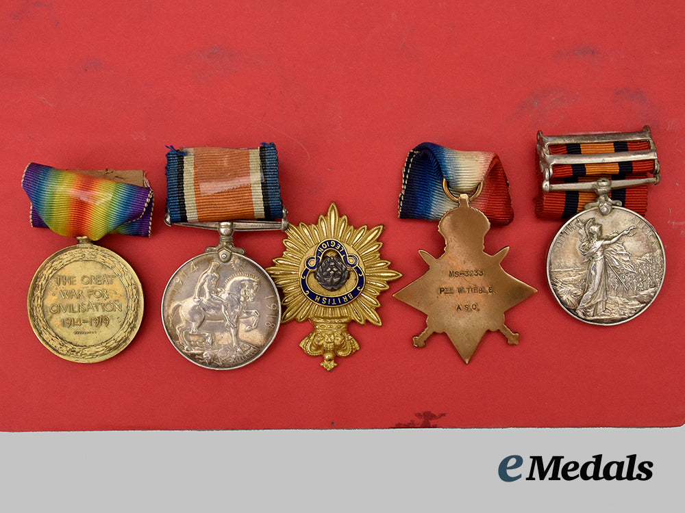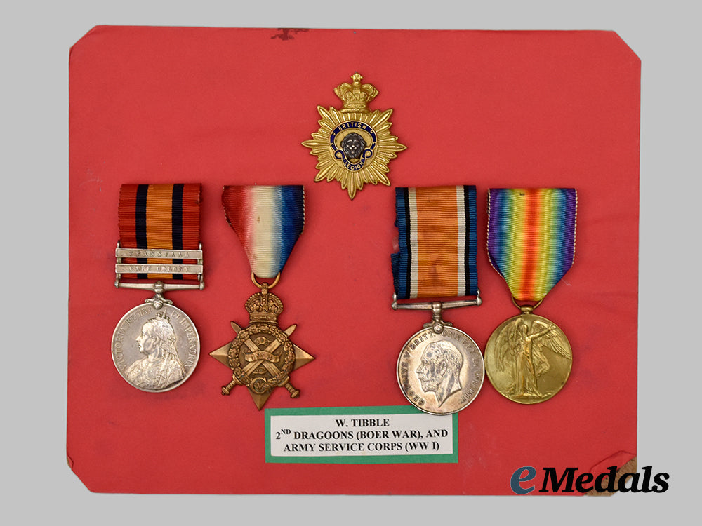 Queen's South Africa Medal, Transvaal, Cape Colony (5092 PTE. W.E. TRIBBLE. 2ND DRGNS) 1914 Star (MS-3233 PTE. W. TRIBBLE. A.S.C.) War Medal 1914-1918 ( MS-3233 PTE. W. TRIBBLE. A.S.C.), Victory Medal (MS-3233 PTE. W. TRIBBLE. A.S.C.), accompanied by a British Legion Cap Badge in fire gilt and enamel, board mounted, very fine.