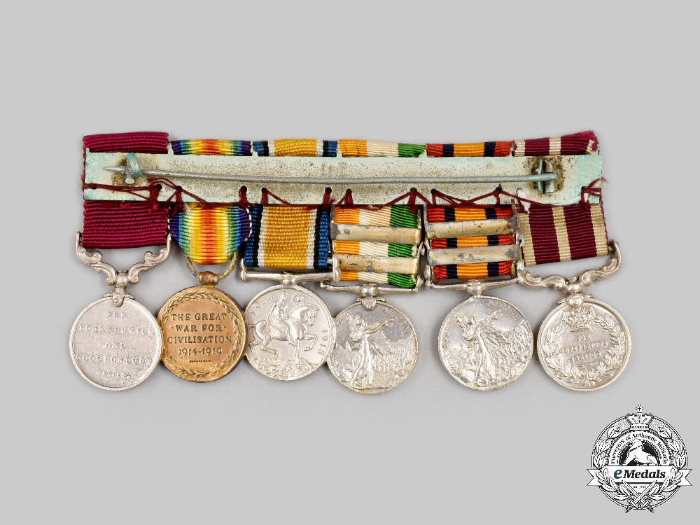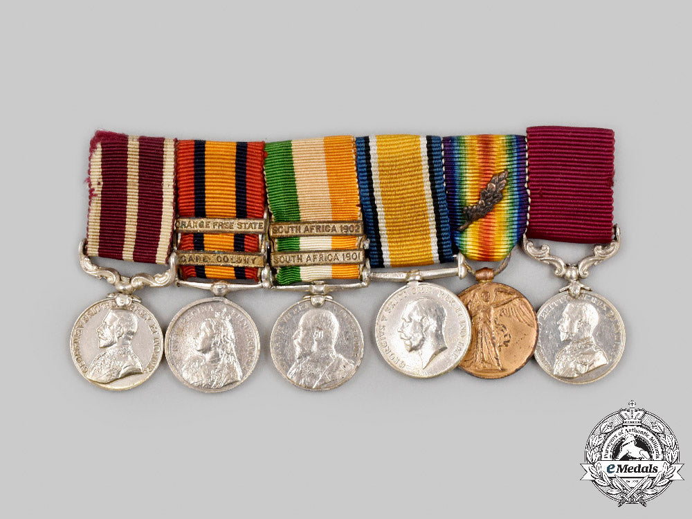 Army Meritorious Service Medal, George V (in silver, measuring 17.7 mm in diameter); Queen's South Africa Medal, 2 Clasps - CAPE COLONY, ORANGE FREE STATE (in silver, measuring 18 mm in diameter); King's South Africa Medal, 2 Clasps - SOUTH AFRICA 1901, SOUTH AFRICA 1902 (in silver, measuring 17.5 mm in diameter); British War Medal with MID Oak Leaf (in silver, measuring 18.2 mm in diameter); Victory Medal (in bronze, measuring 18.2 mm in diameter); and Army Long Service and Good Conduct Medal, George V (in silver, measuring 17.8 mm in diameter). Mounted to a suspension with swing bar pinback, as worn by the veteran, bruising on the KSM, light contact overall, original ribbons, better than very fine.