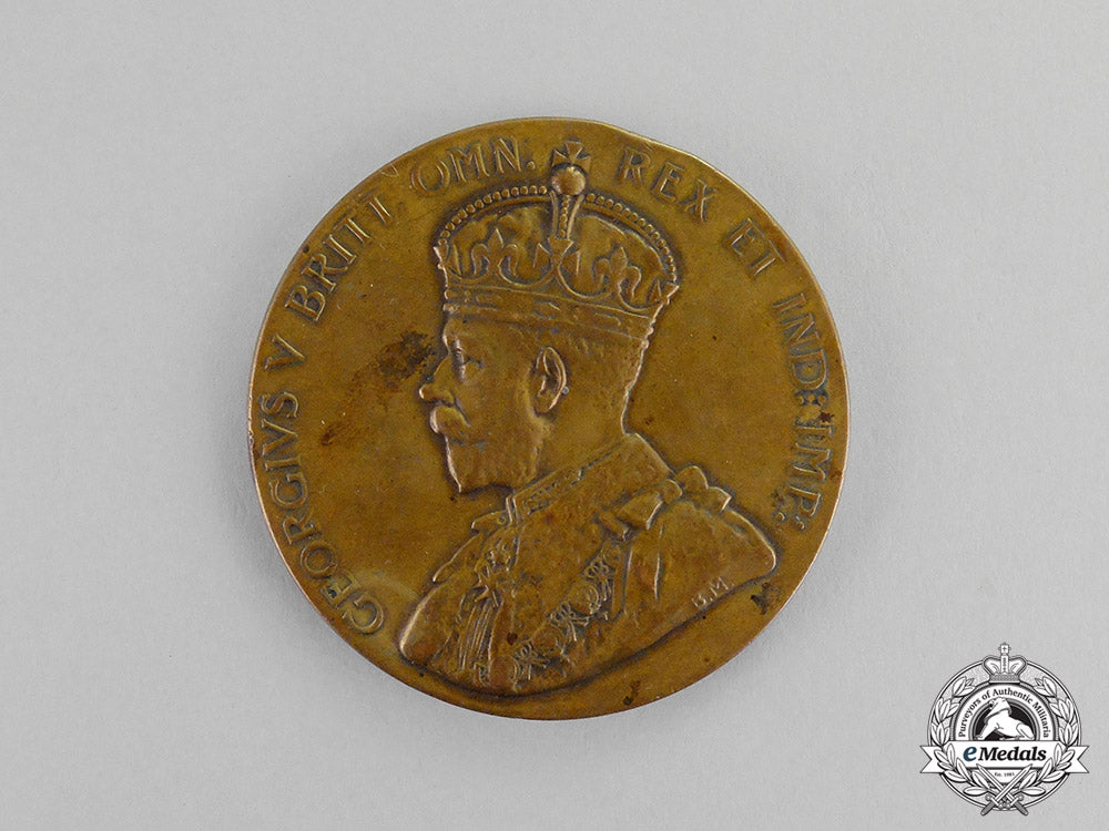 Great Britain; Bronze, obverse illustrating the left-facing bust of King George V, surrounded by the inscription "GEORGIVS V BRITT OMN: REX ET IND: IMP:" and engraver marked "B.M." (Bertram Mackenna) at the base of the bust, reverse illustrating three women, the woman in the foreground bent over and carrying a bundle of wheat sheaves, the woman in the centre standing and holding a small house in her hands, the standing woman at the back resting her hands on a lever with a large wheel in front, with the faded engraver mark "P.M." (Percy Metcalfe) at the lower left, 51.2 mm, edge nicks, surface wear, contact marks, very fine.