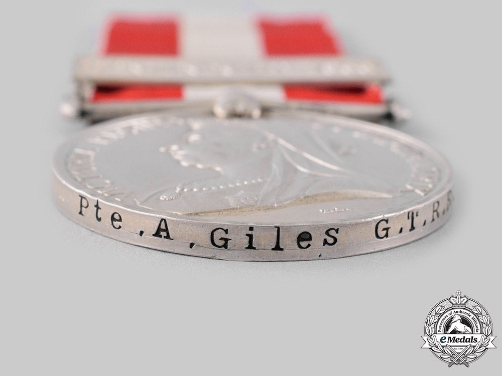 FENIAN RAID 1866 (Pte. A. Giles G.T.R.R.). Naming is officially impressed. Edge nicks, very light contact, replacement ribbon, better than very fine.