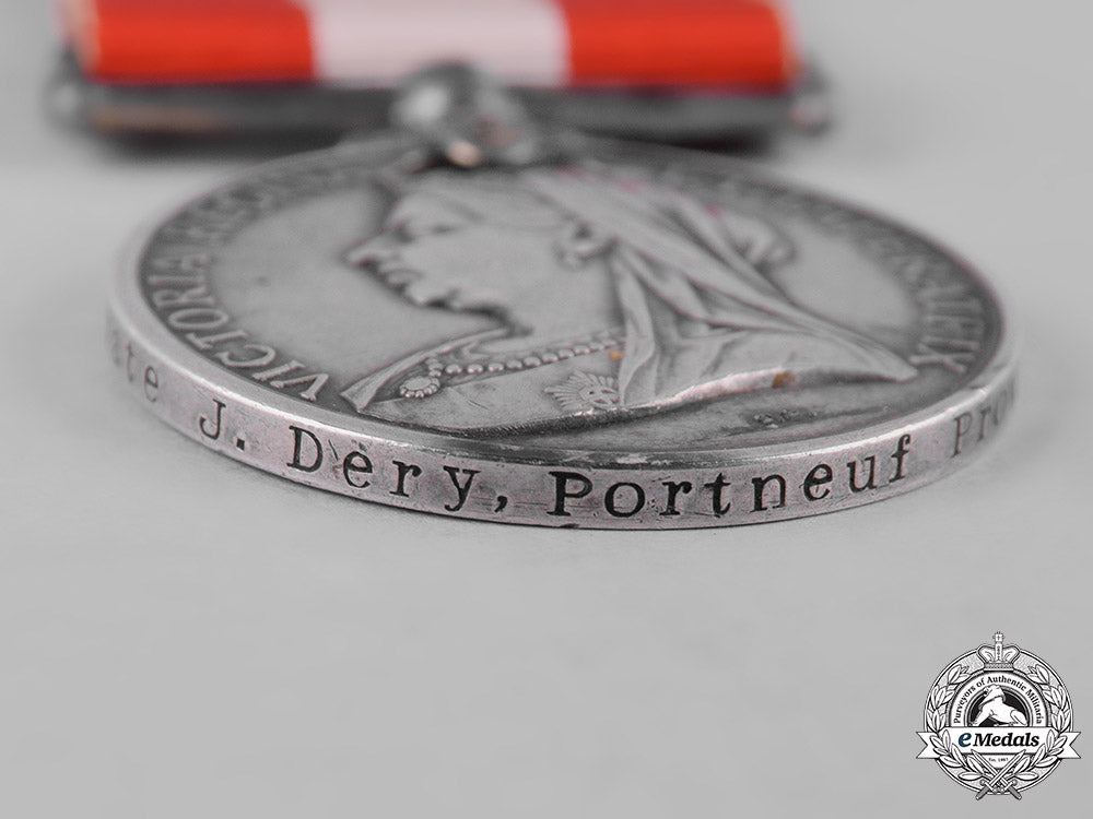 (Private J. Dery, Portneuf Prov. Batt.). Naming is officially impressed. Medal has the bust of Queen Victoria "de-crowned" on the obverse by an area actually being cut out of the medal itself, which also deletes most of text "CANADA" on the reverse, edge nicks, replacement ribbon with pinback, fine.