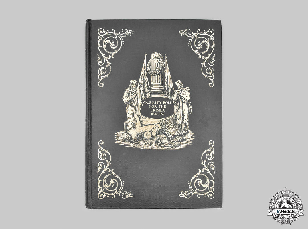 Hardcover, black cloth cover, the front and back covers along with the spine bearing images and text embossed in gold-coloured ink, entitled "Casualty Roll for the Crimea 1854-1855 - The Casualty Rolls for the Siege of Sebastopol and other Major Actions during the Crimean War 1854-1856", compiled by Frank and Andrea Cook, edited and arranged by John B. Hayward, foreword by Vivian Stuart, published by J.B. Hayward and Son (Medal Specialists) of London in 1976, printed by Eyre & Spottiswoode Limited of London - Her Majesty's Printers, ISBN 0 903754 10 X. The book begins with a List of Plates, Maps and Plans, Editor's Notes, Compiler's Notes and Foreword, followed by the Casualty Roll for Crimea. The roll is documented under two basic headings: 1. The Army (nine subsections: (i) The Battle of Alma, 20th September 1854; (ii) The First Bombardment of Sebastopol, 17th October 1854, First Battle of Inkermann, 26th October 1854 and Minor Actions; (iii) The Action at Balaklava, 25th October 1854; (iv) The Battle of Inkermann, 5th November 1854; (v) The Assault on the Quarries, 7th June 1855; (vi) The First Attack on the Redan, 18th June 1855; (vii) The Final Attack on the Redan, 8th September 1855; (viii) The Second, Third, Fourth, Fifth and Final Bombardment of Sebastopol and Minor Actions, 5th November 1854 - 8th September 1855; (ix) The Magazine Explosion at the French Siege Train, 15th November 1855); 2. The Royal Navy and Royal Marines (two subsections: (a) The Bombardment of Sebastopol by the Naval Squadron, 17th October 1854; (b) The Naval Brigade, 1854-1855): each stating the combatant's last name, first name, his rank, service number (some), the type of casualty, the date it occurred (some), the date of gazetting in the London Gazette (some). It has twenty engravings illustrating key battles and figures placed throughout the book and concludes with an Appendices and Index. The book contains 298 pages printed in black ink, one of which is a two-panel fold out, on an off-white paper stock, gold-leafing on the edges of the pages, measuring 215 mm (w) x 303 mm (h) x 25 mm (d), the previous owner's name stamped in black ink on the free end paper of the inside front cover, near extremely fine.