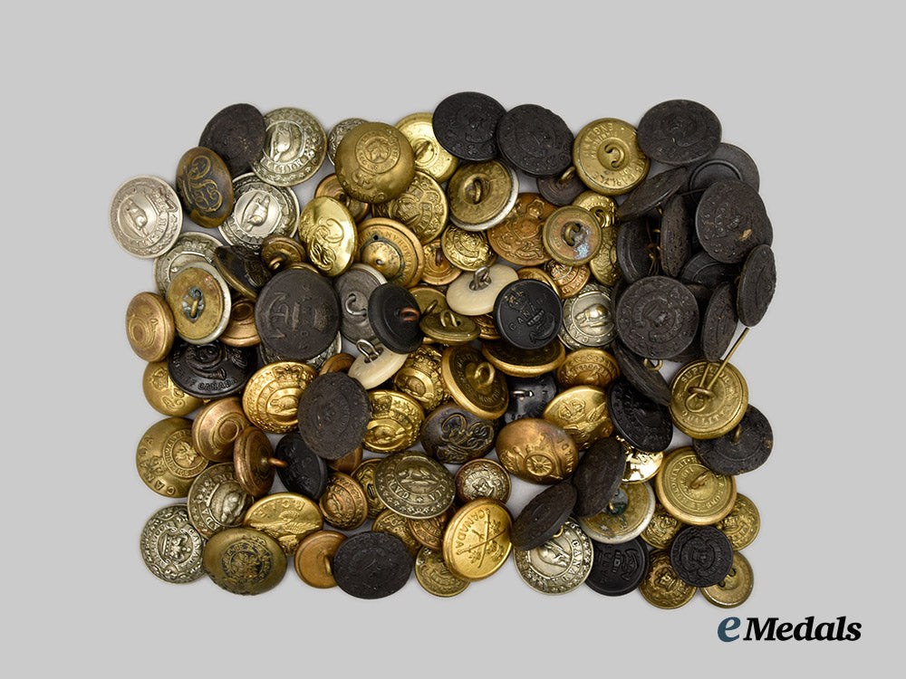 This is a well-preserved group of over 50 British and Canadian military livery buttons, including Canada Militia Victoria Crown buttons. Buttons ranging from fine to extremely fine.
