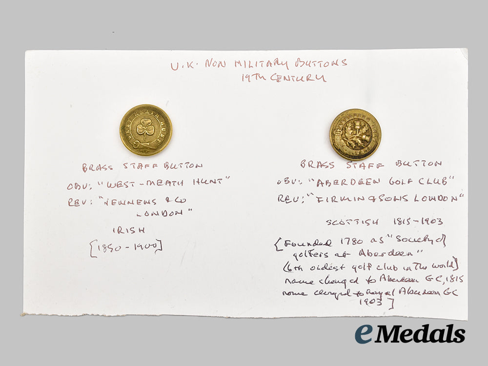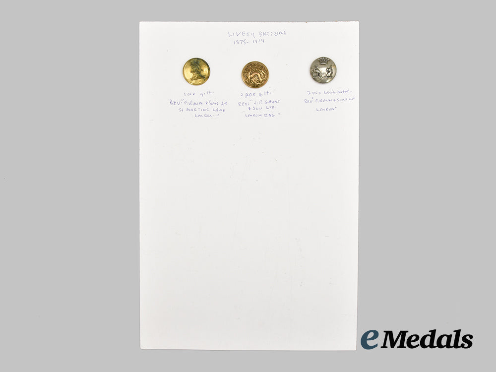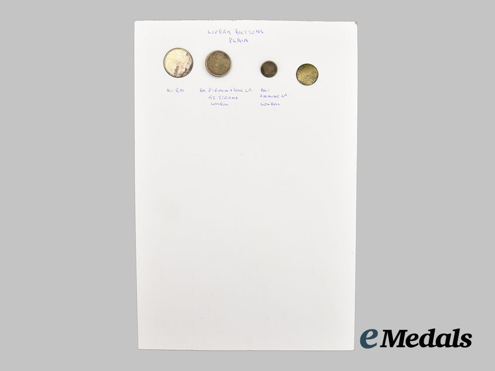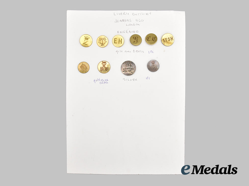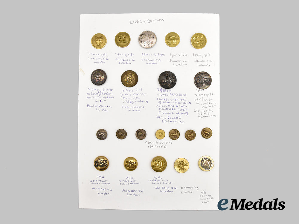 This is an extensive and extremely well-preserved group of 51 British military livery buttons, including: three livery buttons from 1875-1914; ten engraved livery buttons from JENNENS & CO LONDON; four plain livery buttons; twenty-one miscellaneous British livery buttons including seven hunting cast buttons; ten British military livery buttons; two UK non-military 19th century buttons; and one County Asylum Winwick gilt button. Buttons ranging from fine to extremely fine.
