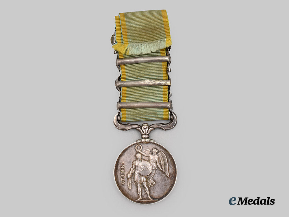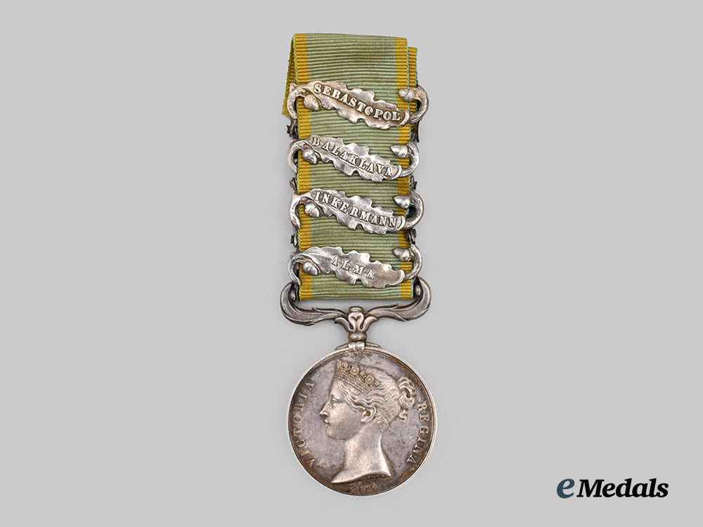 Footnote: The Crimea Medal was a campaign medal approved on December 15, 1854, for issue to officers and men of British units (land and naval) which fought in the Crimean War of 1854-1856 against Russia. The medal was awarded with the British version of the Turkish Crimea Medal, but when a consignment of these was lost at sea, some troops received the Sardinian version.