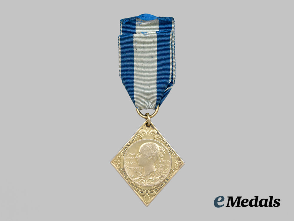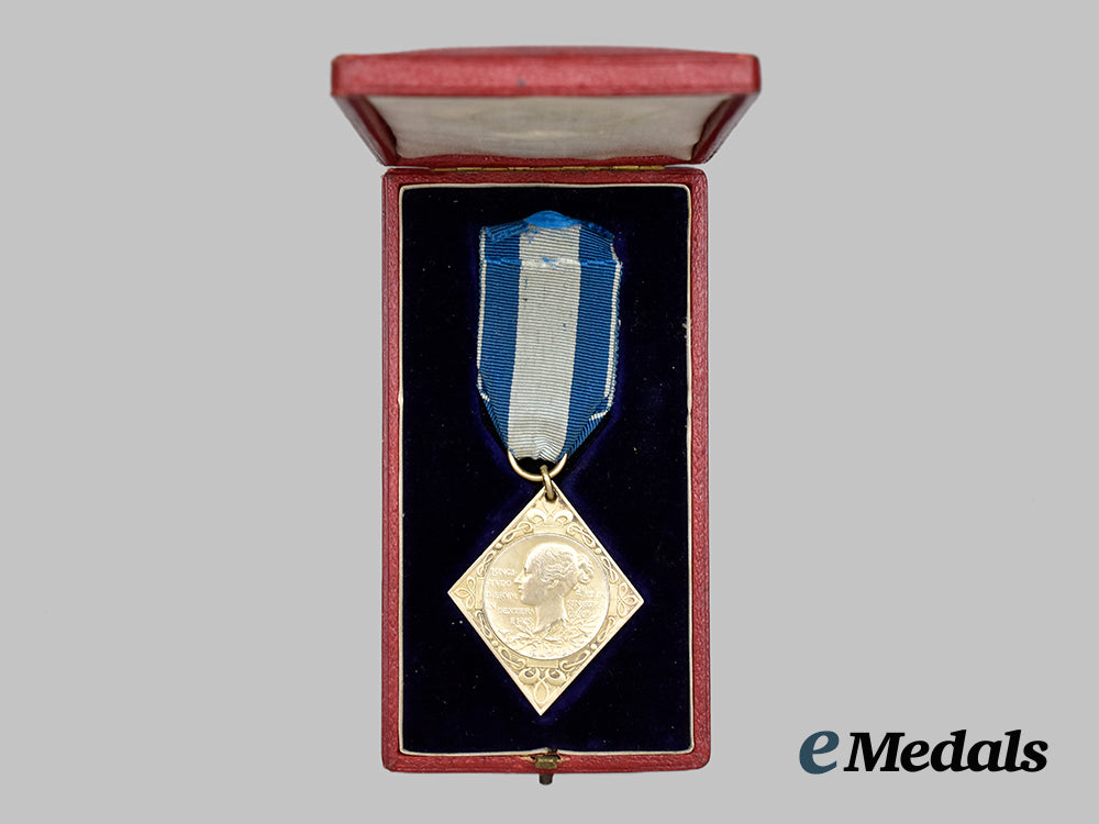 Instituted in 1897. Mayor Provost Issue. In silver, lozenge-shaped, obverse centre shows the profile of Queen Victoria facing left, reverse shows the profile of young Victoria facing left, on original silk ribbon, 48 mm (h) x wo mm (w), extremely fine condition. Housed in original case, Imperial crown with the dates 1837-1897 on the cover, extremely fine condition.