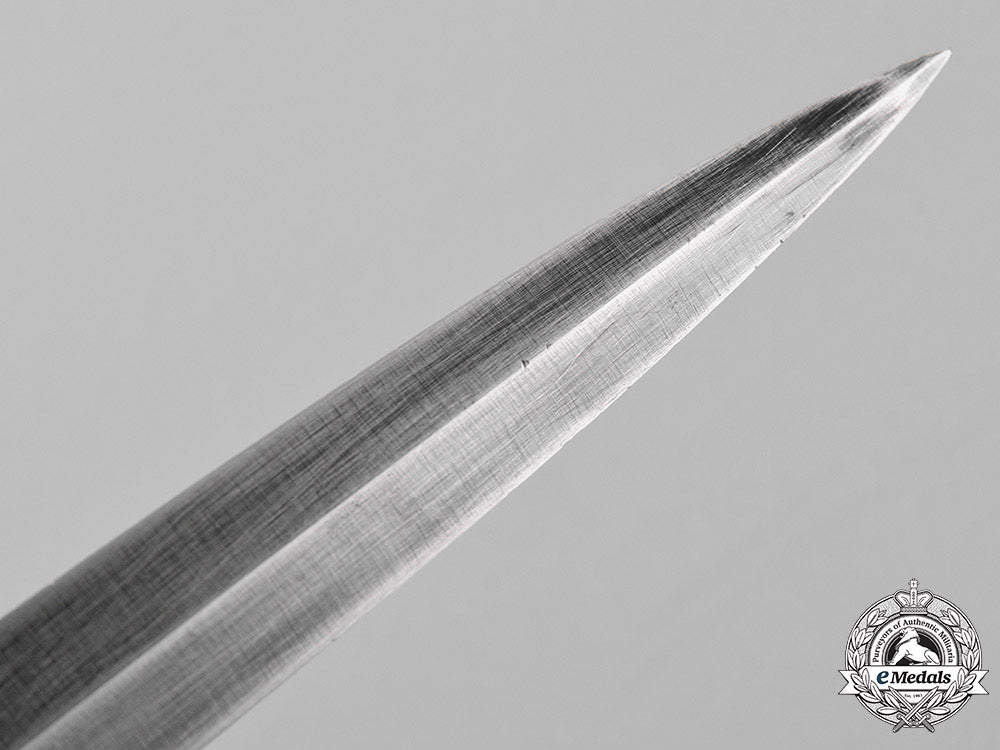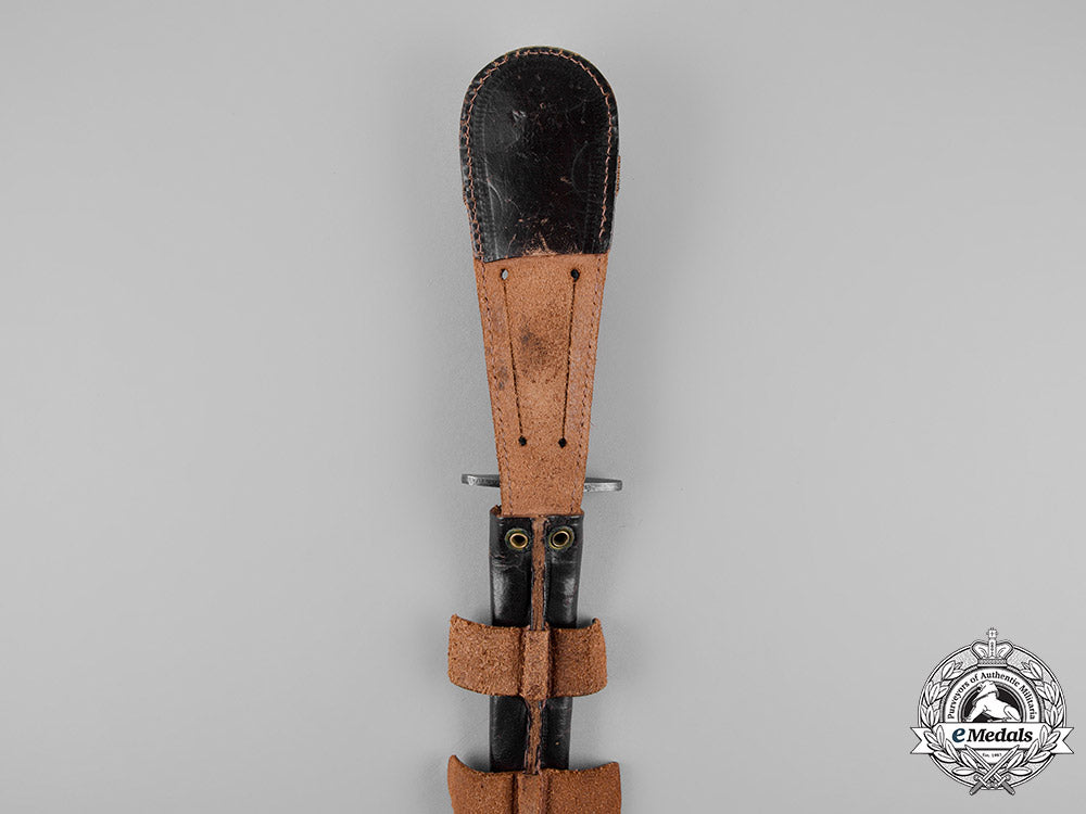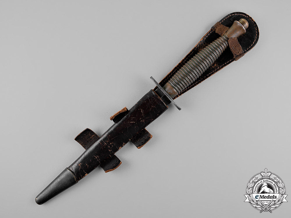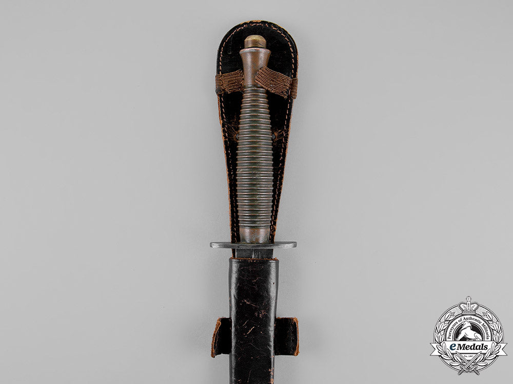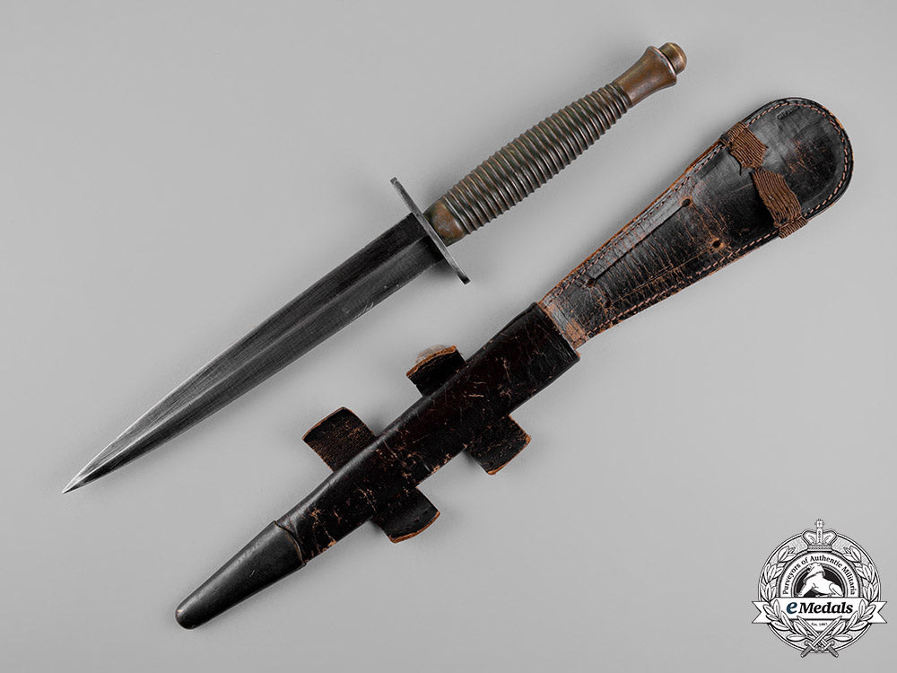 Great Britain Exported to North America. Steel blade, magnetic, measuring 175 mm in length, with very sharp edges and a very sharp tip, exhibiting scattered surface wear and minor scratches from regular usage. Solid metal crossguard, with ribbed grip on the bronze handle, mould marked "4" on the handle near the domed "skull-cracker" pommel, measuring 297 mm in length overall, very fine. Accompanied by its supple leather scabbard, with a blackened bronze chape, two horizontal straps on the back, with two slits on the protruding strap for belt attachment, the elasticized securing strap above having separated in the centre, measuring 47 mm x 330 mm, exhibiting light age wear in the leathers, scabbard also very fine.