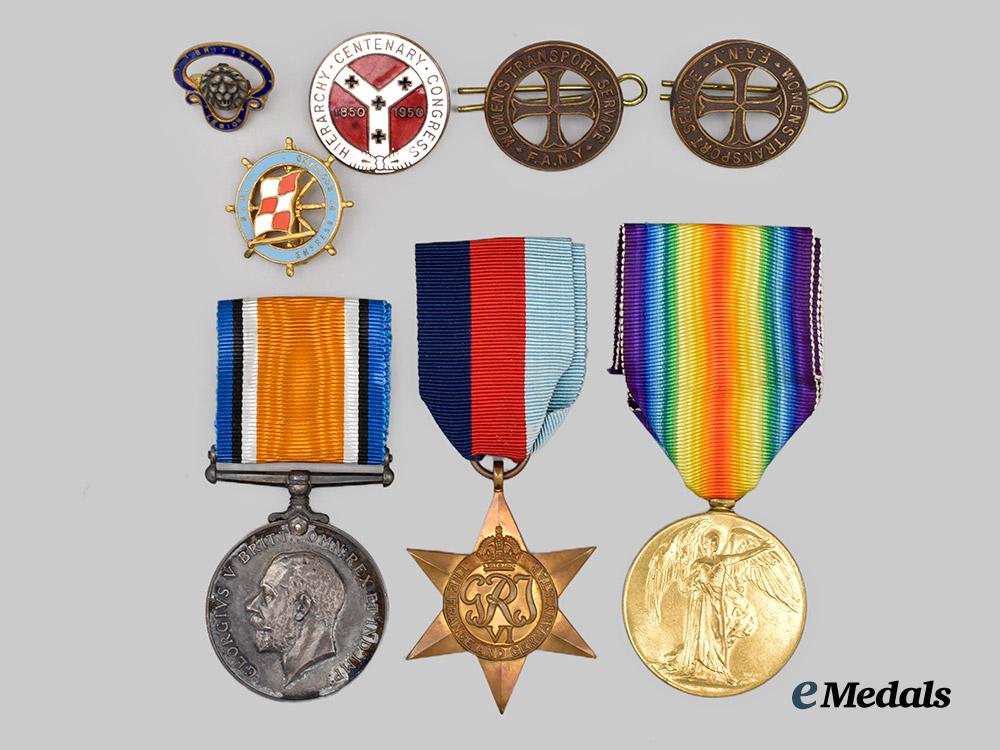 Accompanied by two Women’s Transport Service collar tabs, brass with two lugs on reverse, very fine, and three pins: a British Legion pin, S.S Empress of Scotland pin, and Hierarchy Centenary Congress pin, all in very fine condition.