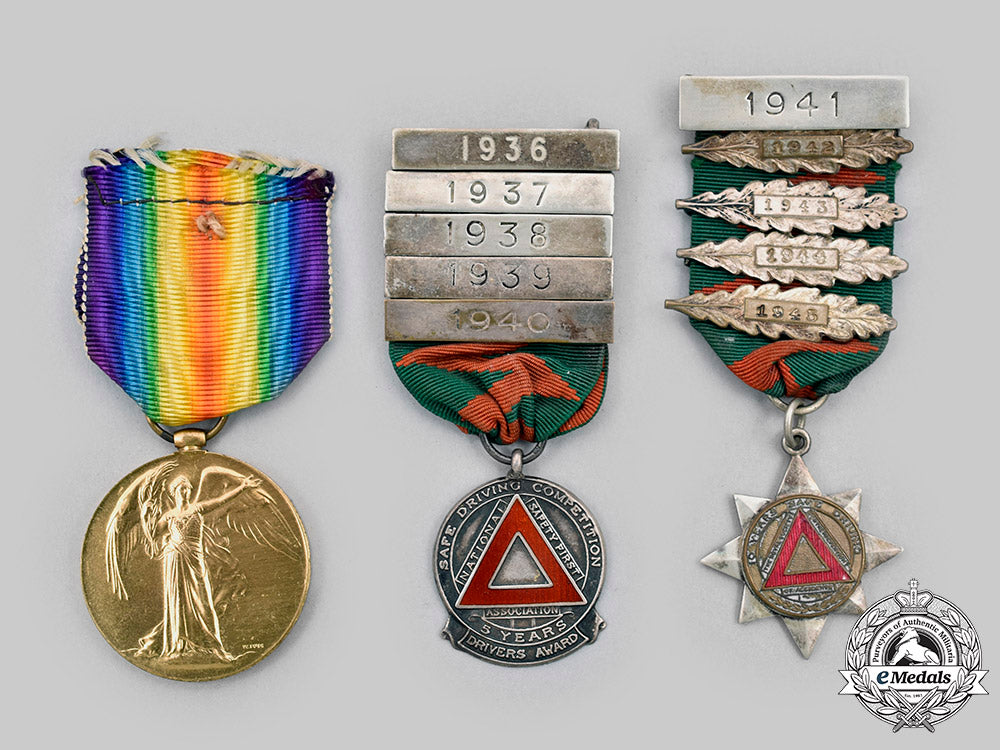 3. Royal Society for the Prevention of Accidents Drivers Award for 10 Years Safe Driving with Four Clasps (two-piece construction, in silvered and gilt bronze with red enamels, recipient engraved "J. CARVER" on the reverse, measuring 32.5 mm (w) x 37 mm (h) inclusive of its integral suspension, with four silvered bronze oak leaf clasps dated "1942, 1943, 1944, 1945" respectively, on its original ribbon, suspended from a hanger with pinback dated "1941"). Better than very fine.