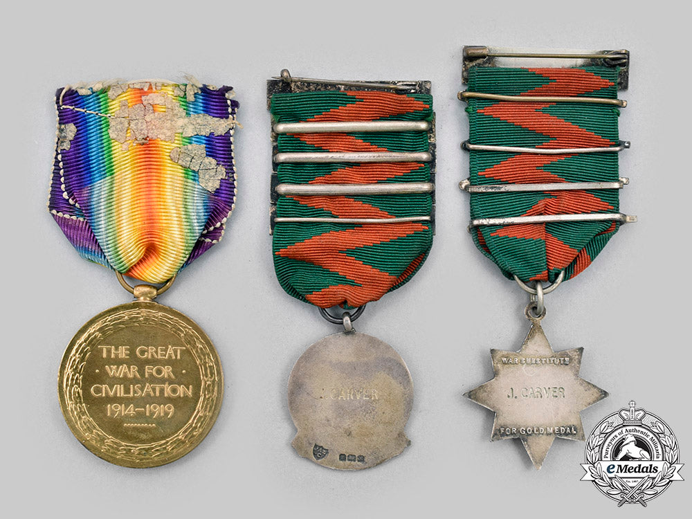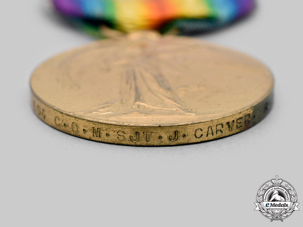 1. First War Victory Medal to Company Quartermaster Sergeant James Carver, Royal Engineers (in bronze gilt, impressed "604 C.Q.M. SJT. J. CARVER. R.E." on the edge, measuring 36.2 mm in diameter, residue evident on the ribbon from previous board mounting);