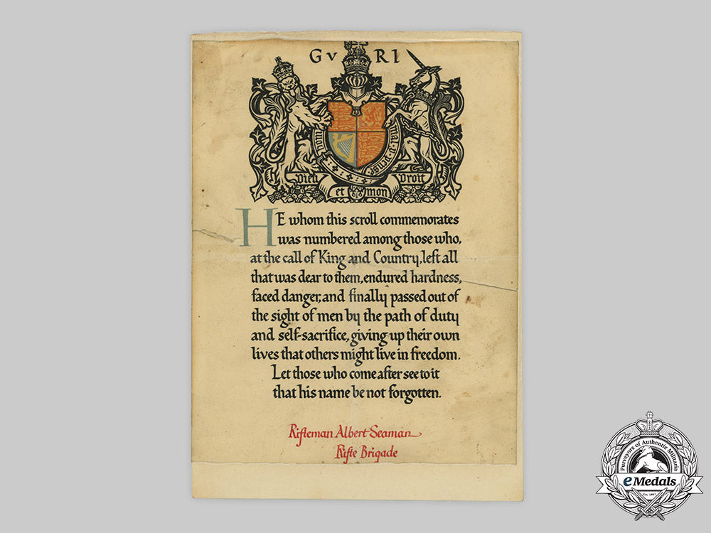 Scroll is printed in four-colour inks, on an off-white paper stock, bearing the United Kingdom coat-of-arms, with the name on the scroll inscribed in red "Rifleman Albert Seaman / Rifle Brigade", measuring 178 mm (w) x 230 mm (h), mounted to a 180 mm (w) x 257 mm (h) board, lacquered, with a brief biographical note taped in place on the reverse, the original document lightly soiled and showing through the lacquered finish, fine.