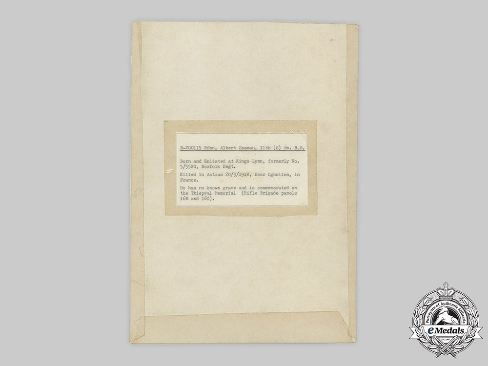 Footnote: Albert Seaman was born at King's Lynn, Norfolk, England. He had previous been a Private (5/5520) with the Norfolk Regiment when he enlisted as a Rifleman (B/200115) with the 11th Battalion, Rifle Brigade (The Prince Consort's Own). He was Killed in Action on March 20, 1918 at Ognolles, a commune in the Oise Department in Northern France, likely during Operation Michael. He has no known grave and was initially commemorated on the Thiepval Memorial in the Somme. Rifleman Albert Seaman is acknowledged on the Commonwealth War Graves website as officially having died between March 22 and April 1, 1918. His commemoration has recently been transferred to the Pozieres Memorial, with an additional panel to be placed. As it was not possible to add his name to the Pozieres Memorial immediately, his name will be remain on the Thievpal Memorial and will be removed when the appropriate panel is replaced on the Pozieres Memorial. For his First World War service, he was posthumously awarded the British War Medal and the Victory Medal.