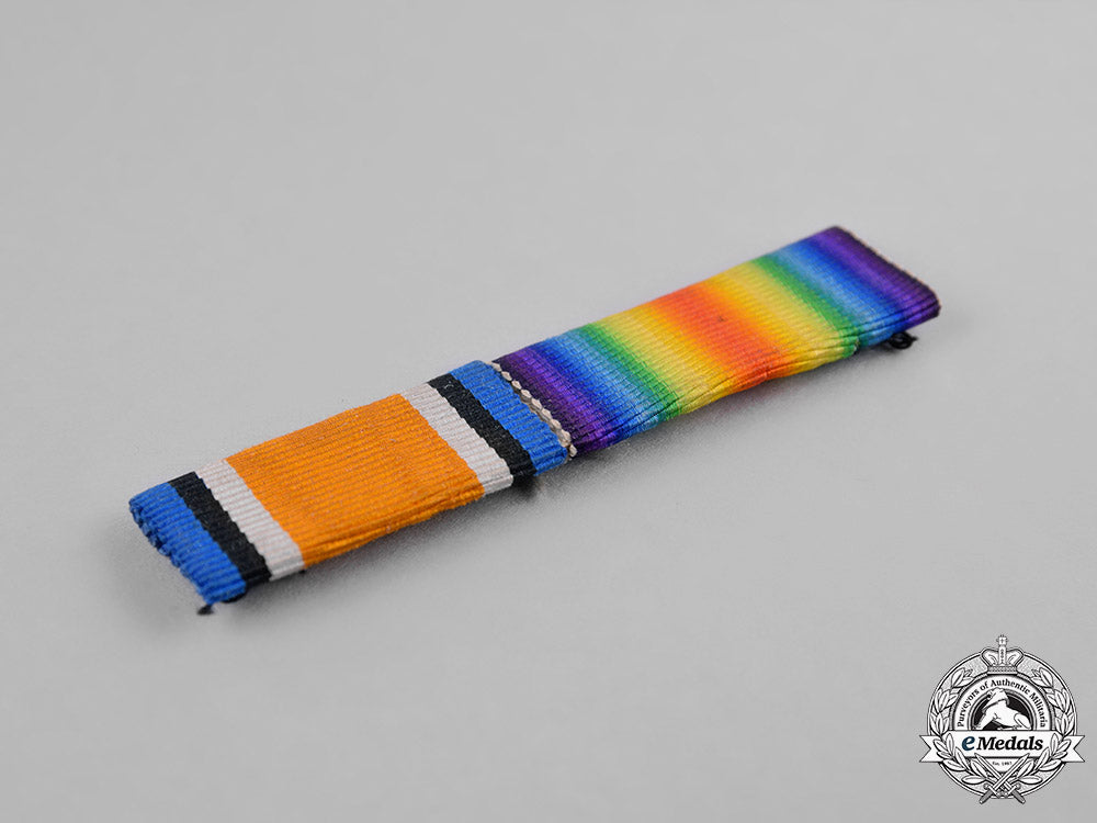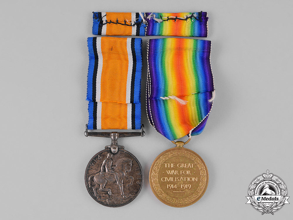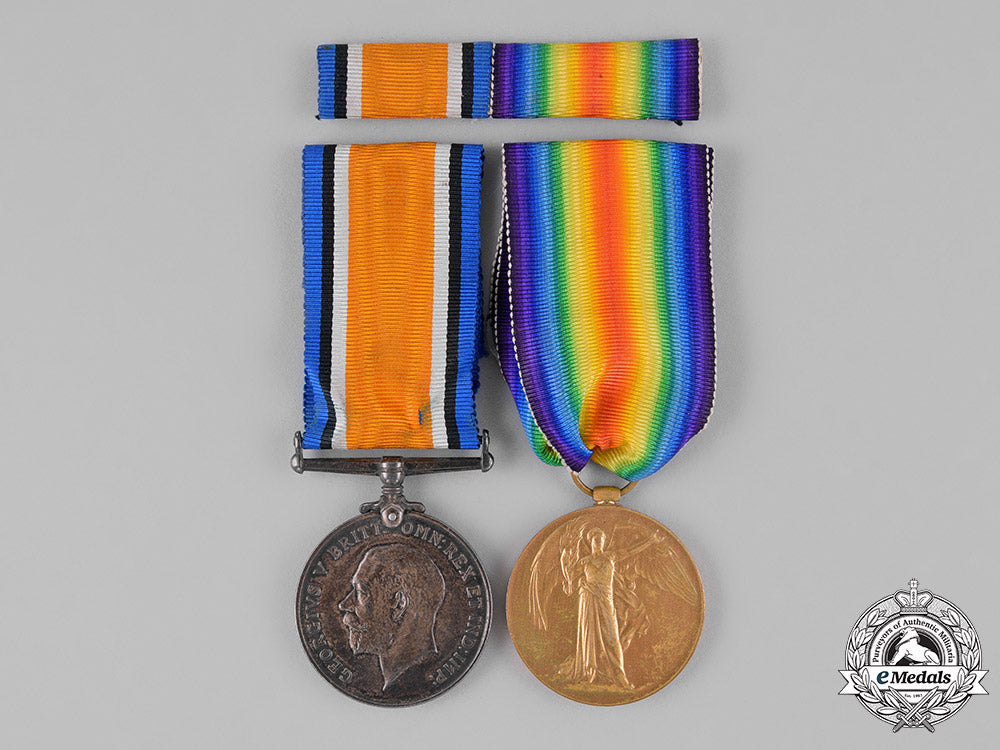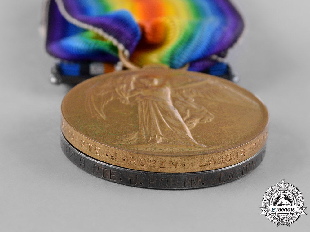 British War Medal (316229 PTE. J. ROBIN. LABOUR CORPS.); and Victory Medal (316229 PTE. J. ROBIN. LABOUR CORPS.). Naming is officially impressed. Un-mounted, dark patina on the BWM, very light contact, replacement ribbons, better than very fine. Accompanied by a 70 mm (w) x 15 mm (h) ribbon bar and his newspaper obituary.