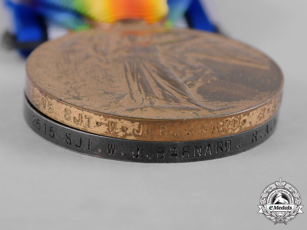 British War Medal (2515 SJT. W.J. BARNARD. R.A.M.C.); and Victory Medal (2515 SJT. W.J. BARNARD. R.A.M.C.). Naming is officially impressed. Un-mounted, very dark patina on the BWM, gilt wear and contact marks on the VM, replacement ribbons, better than very fine.
