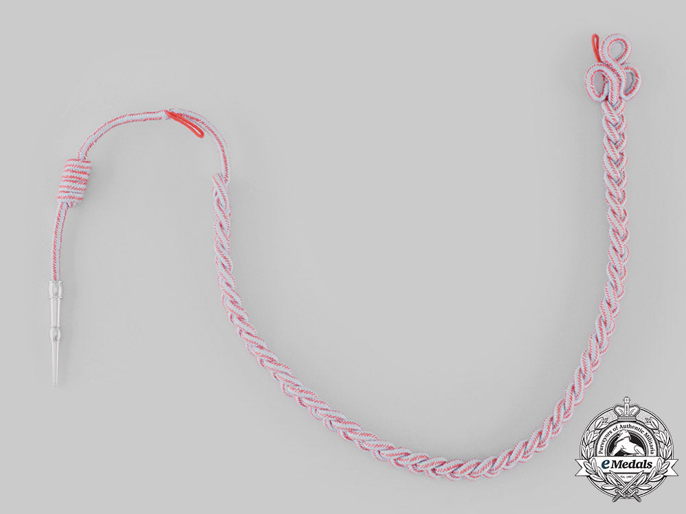 Two Fourragères: War Cross (Croix de Guerre) Fourragère (cord in red and green embroidery wrapped around a central core, braided, tied in a knot and bearing three loops at one end, the other end with the extension of the braided cord appearing, tied in a series of rolled knots at the mid-point and finished with a 71 mm long silvered metal tip, measuring 925 mm in length) and War Cross for Foreign Operational Theatres (Croix de Guerre des théâtres d'opérations extérieures) Fourragère (cord in red and light blue embroidery wrapped around a central core, braided, tied in a knot and bearing three loops at one end, the other end with the extension of the braided cord appearing, tied in a series of rolled knots at the mid-point and finished with a 71 mm long silvered metal tip, measuring approximately 947 mm in length);