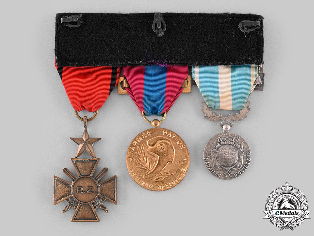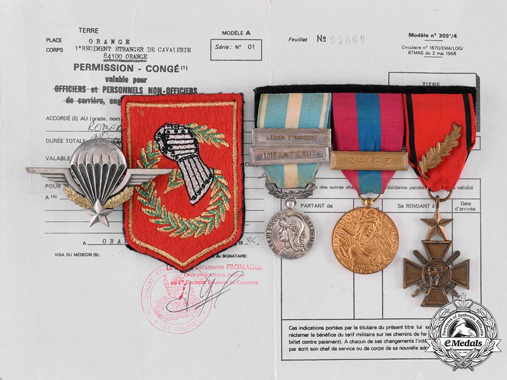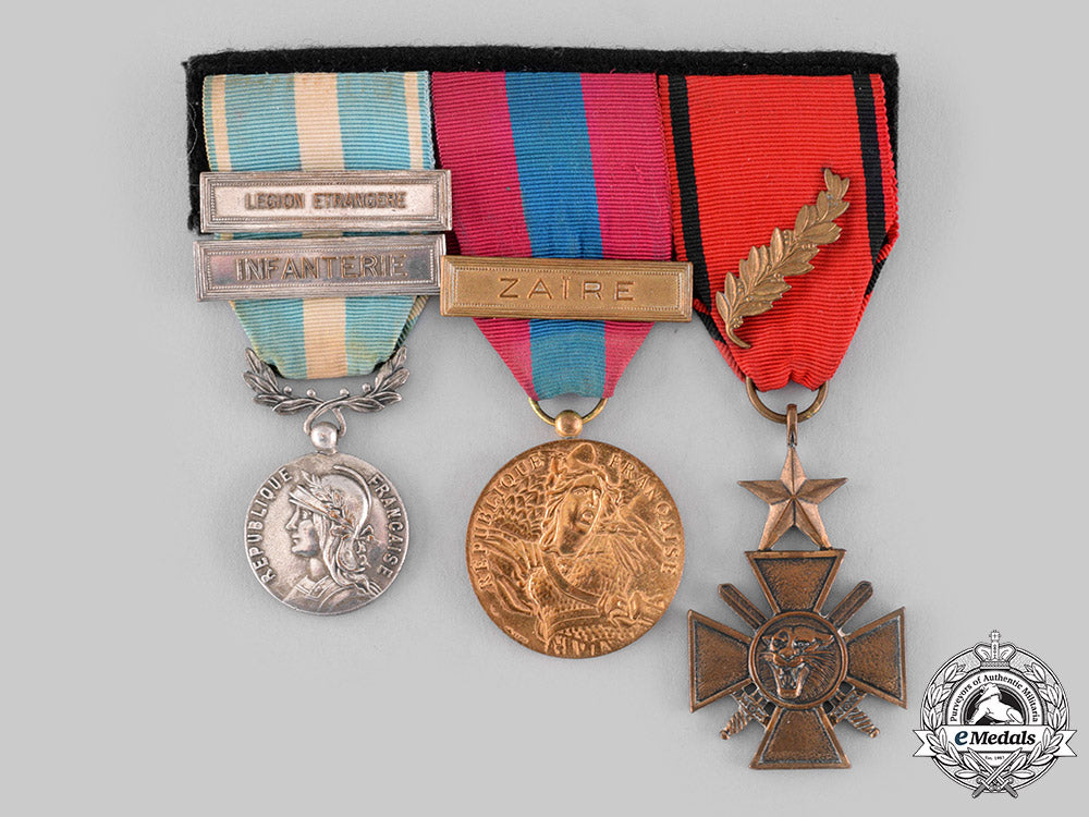 and Republic of Zaire: Cross of Bravery with Bronze Palm (in bronze, marked "R.Z." (République du Zaïre) on the reverse, measuring 35.7 mm (w) x 53.5 mm (h)). Mounted to a standard Legion black cloth suspension with three hooks on the reverse, original ribbons, the Zaire Cross of Bravery ribbon with a bronze palm affixed, very light contact, near extremely fine.