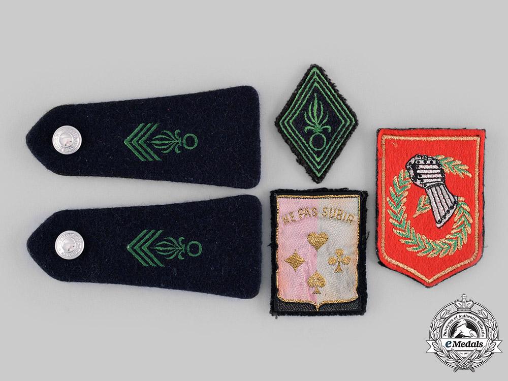 Two Foreign Legion Rank Shoulder Straps (green embroidered insignia on black wool upper, black cotton backer with two straps, silvered button marked "LÉGION ÉTRANGÈRE" (Foreign Legion) held in place by dual prongs at the shoulder end, measuring 60 mm (w) x 137 mm (h) each);