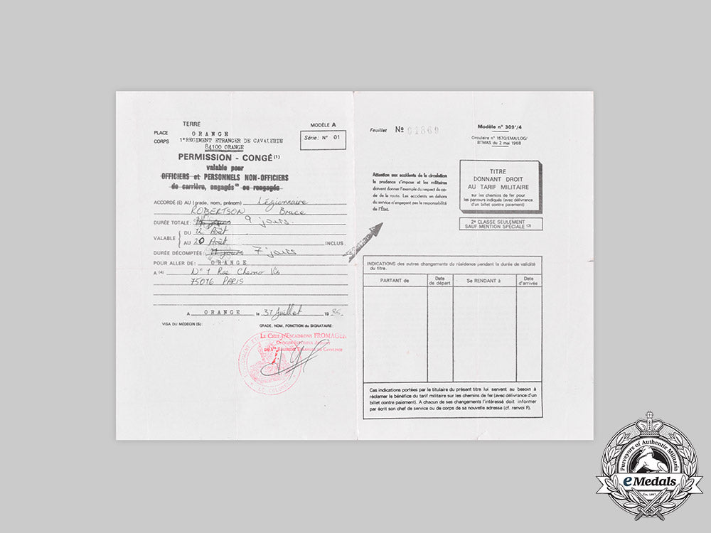 Permission for Leave Pass (issued by the 1st Foreign Cavalry Regiment to Légionnaire Bruce Robertson, on July 31, 1985, granting him nine days' leave, from August 12 to 20, printed in black ink on a white paper stock, measuring 285 mm (w) x 210 mm (h), fold marks);