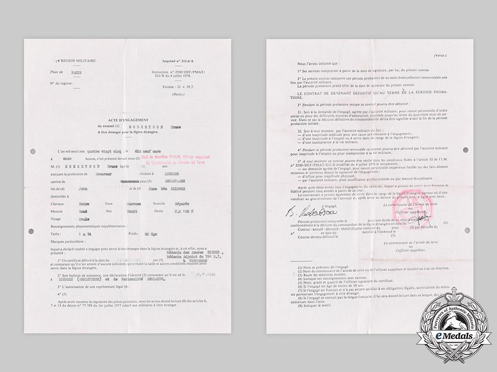 Accompanied by his Engagement Contract (issued at the First Military Region in Paris, dated March 19, 1985 at 11:00 o'clock, named to Légionnaire Bruce Robertson of London, England, age 18, the son of John Robertson and and June Robertson (née Skinner), his occupation stated as Insurer, printed in black ink on a white paper stock, measuring 208 mm (w) x 296 mm (h), fold marks);