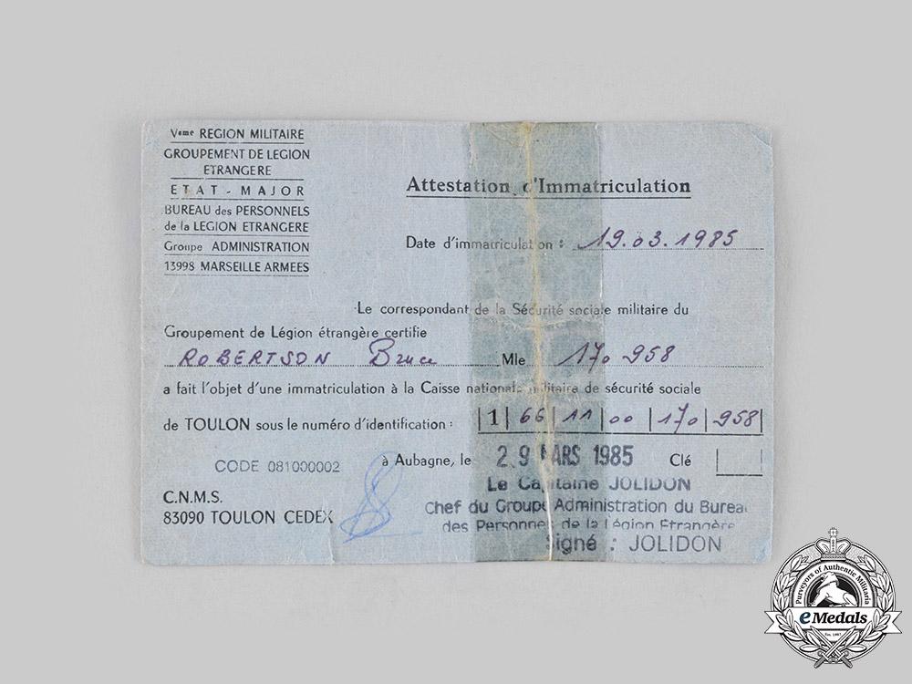 Foreign Legion Certificate of Registration (dated March 19, 1985 and stamped March 29, 1985, to 170958 Bruce Robertson, printed in black ink on a light blue card stock, measuring 118 mm (w) x 83 mm (h), tape repair);