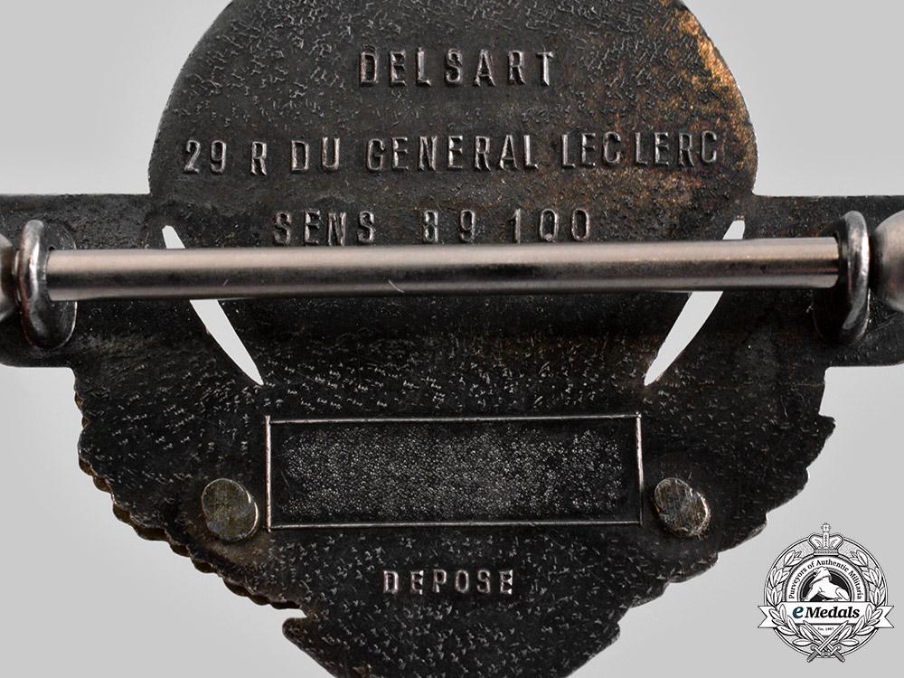 Military Parachutist Brevet Badge (in silver gilt, maker marked "DELSART 29 R DU GENERAL LECLERC SENS 89 100" and marked "DÉPOSÉ" (Deposit) on the reverse, measuring 76.5 mm (w) x 46.3 mm (h), both lugs and bar intact);