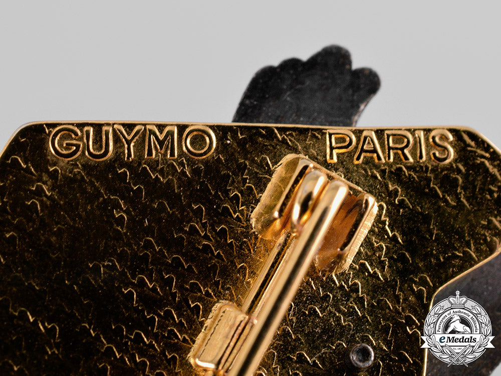 Operation Hawk "Epervier" in Chad Badge (two-piece construction, in silvered and gilt bronze with red, yellow and blue enamels, maker marked "GUYMO PARIS" and marked "Tel: 43.79.22.86" on the reverse, measuring 32 mm (w) x 49.5 mm (h), vertical pinback);