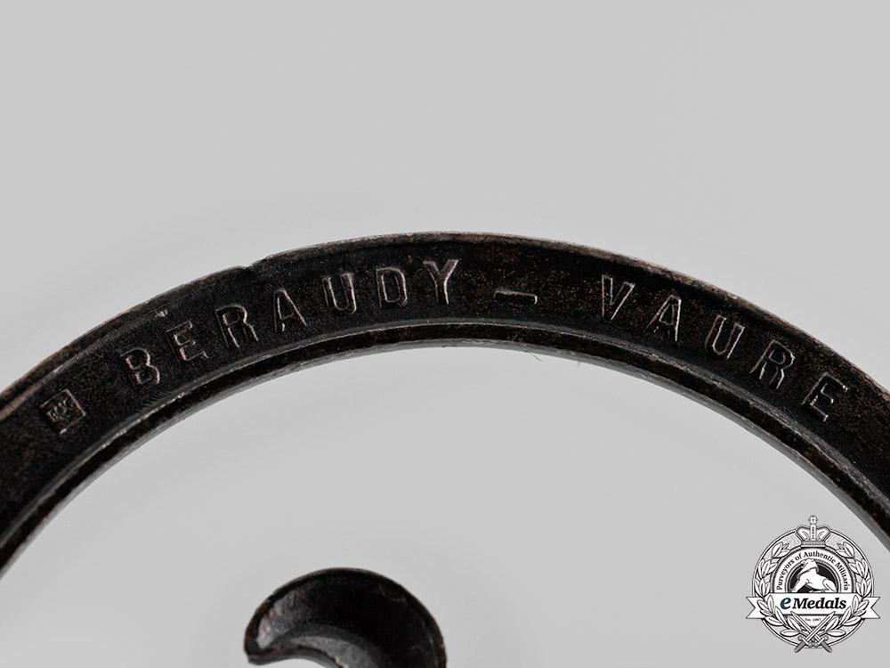 Foreign Legion Cavalry Beret Badge (in chromed silver, maker marked "BERAUDY -VAURE" and marked "AMBERT (P. DE D) 19" on the reverse, measuring 44.3 mm in diameter, both lugs and pin intact);