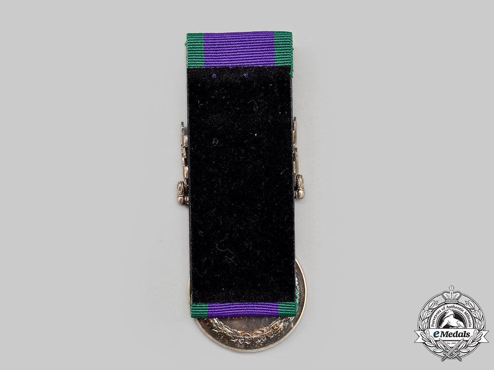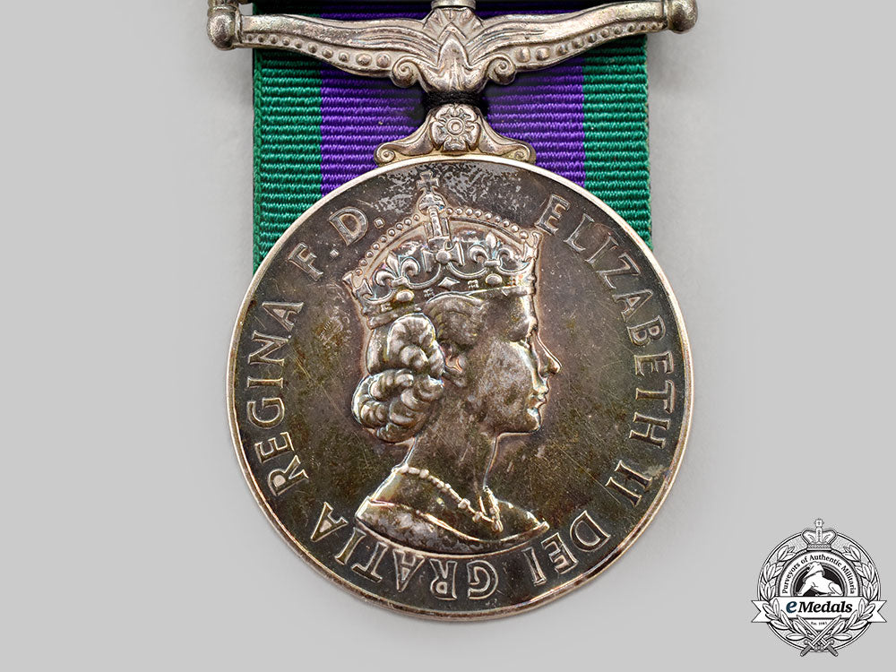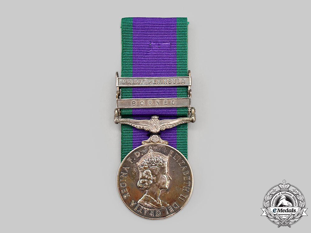 Footnote: The General Service Medal 1962-2007 was awarded for service in particular areas/actions not marked by their own medal, but by a clasp on this one, since 1962. The Borneo clasp was issued for service in North Borneo, Sarawak and Brunei between December 24, 1962 and August 11, 1966. The Malay Peninsula clasp was issued for thirty days' service in the Malay Peninsula and Singapore area between August 17, 1964 and August 11, 1966.