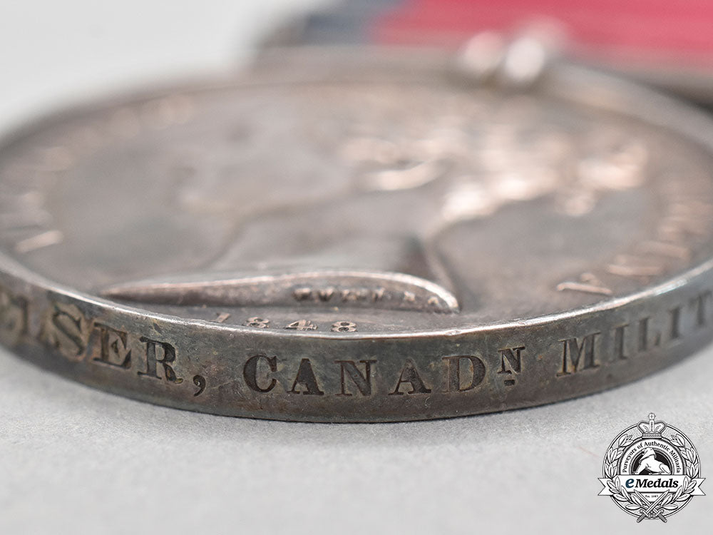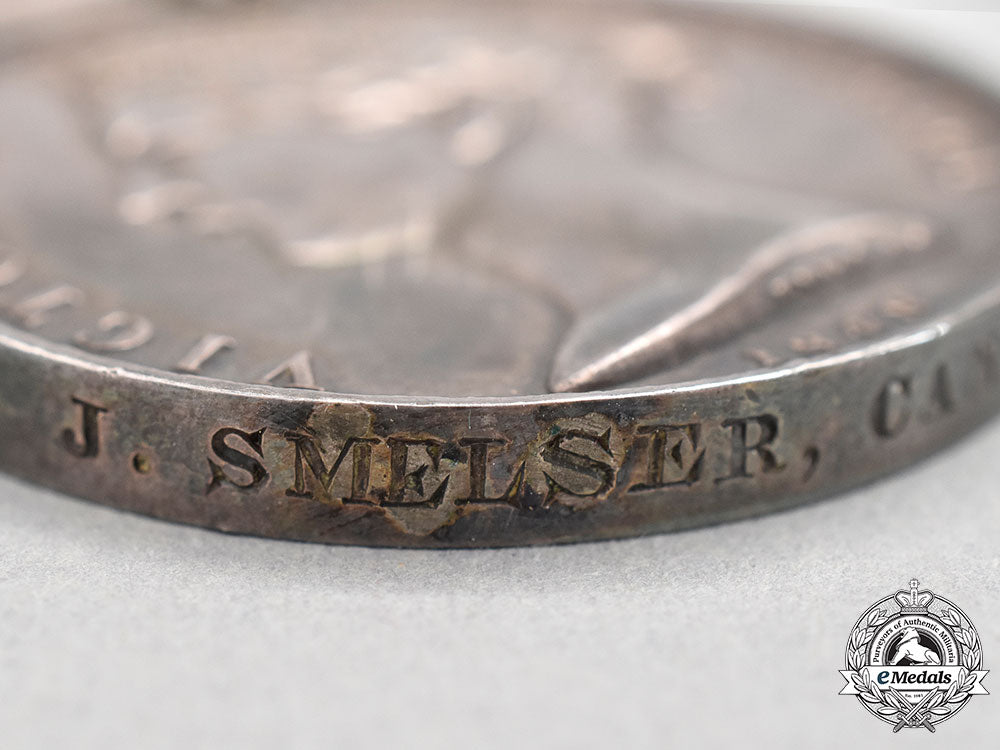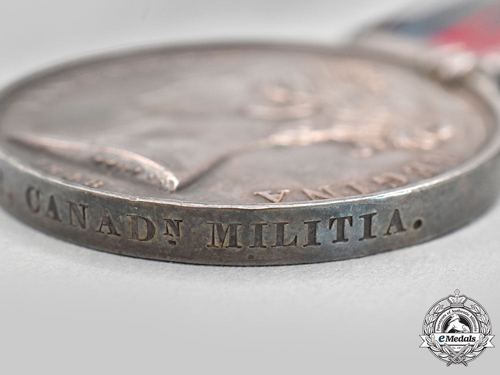 Military General Service Medal, in silver, naming has been period engraved as J. SMELSER, while CANADN MILITIA. is officially impressed, worn on original ribbon with FORT DETROIT clasp, dark patina small edge bruises, in very fine condition.