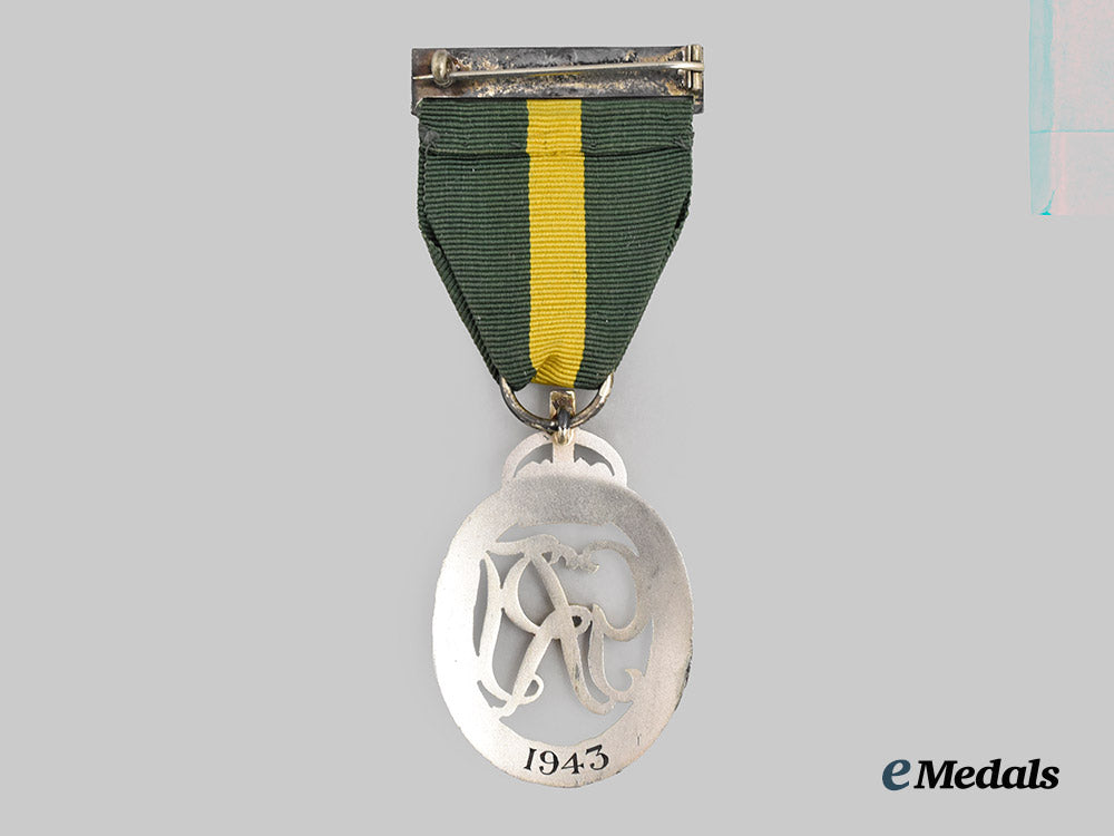 Instituted in 1908. In silver and silver gilt, skeletal oval topped by crown, the obverse bearing the Royal monogram of King George VI, reverse 1943, original ribbon with clasp reading ‘Territorial’,